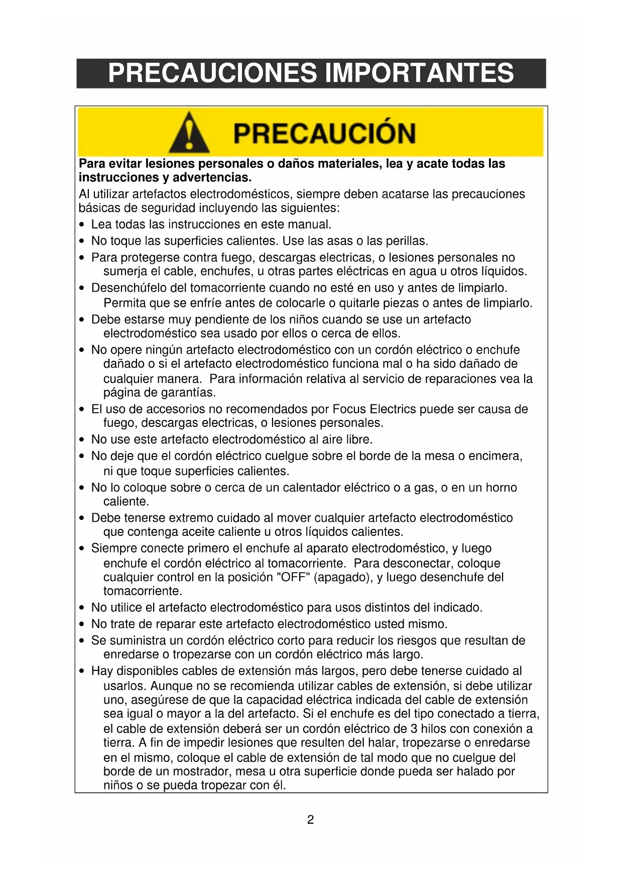 - El uso de accesorios no recomendados por Focus Electrics puede ser causa de fuego, descargas electricas, o lesiones personales.