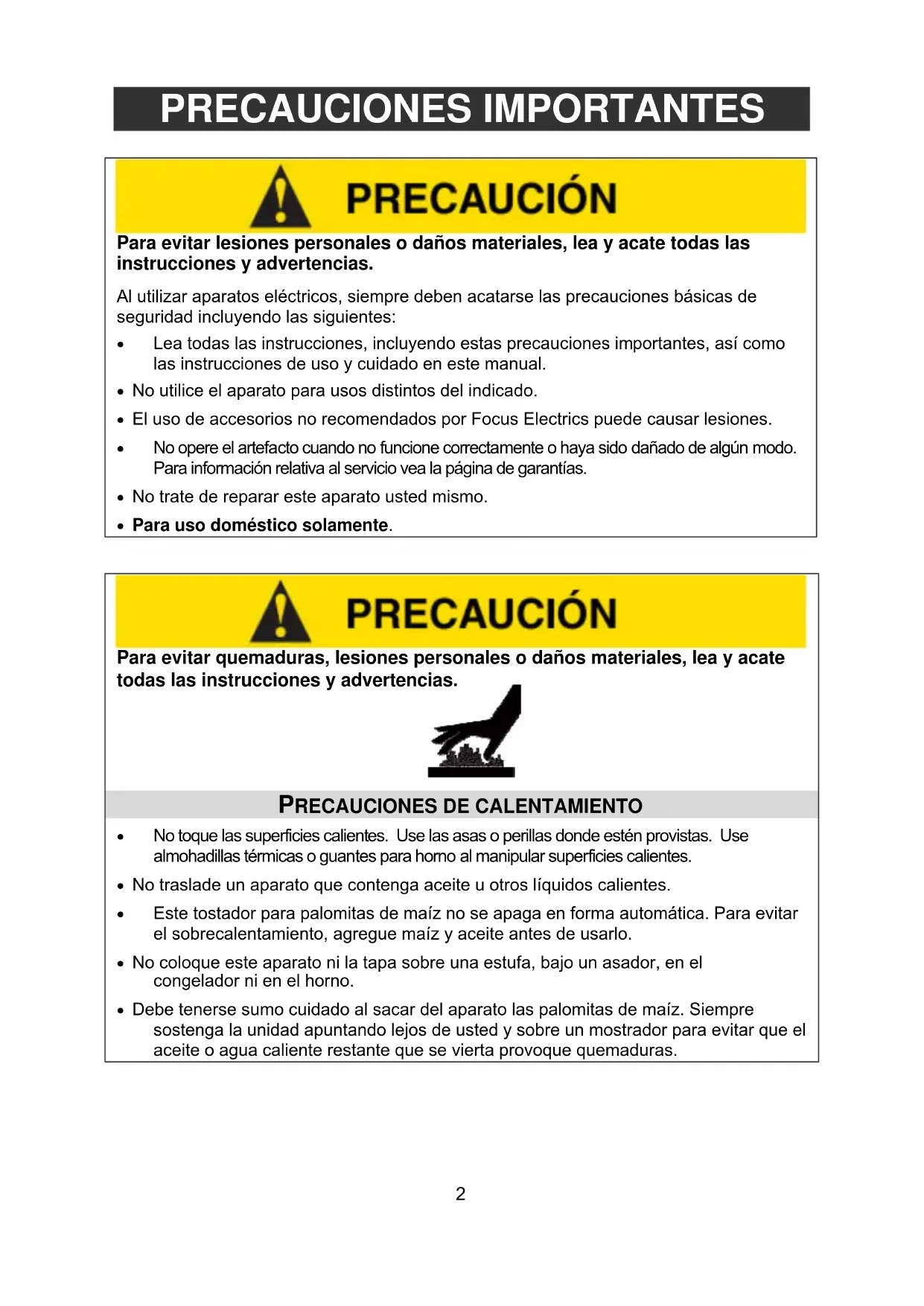 - Debe tenerse sumo cuidado al sacar del aparato las palomitas de maíz. Siempre sostenga la unidad apuntando lejos de usted y sobre un mostrador para evitar que el aceite o agua caliente restante que se vierta provoque quemaduras. 2Para evitar descargas eléctricas, lesiones personales o daños materiales, lea y acate todas las instrucciones y advertencias.