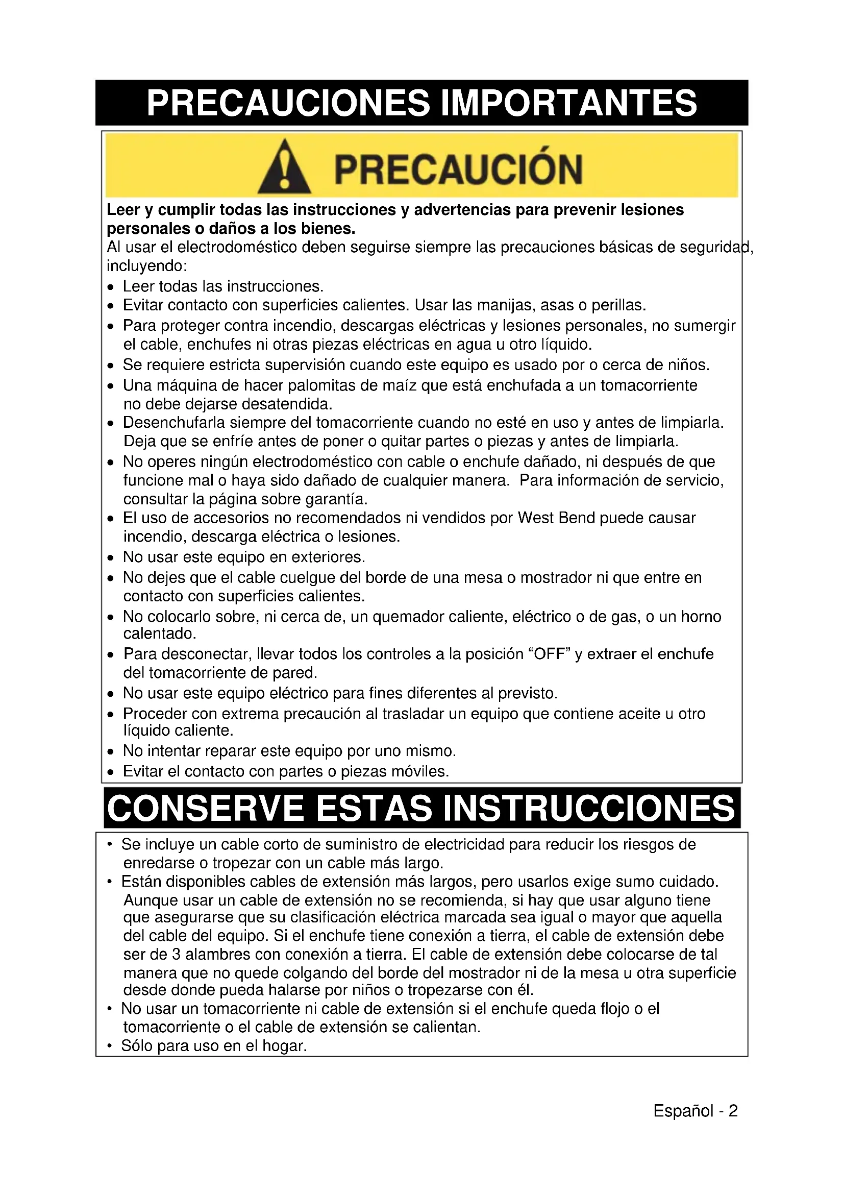 - El uso de accesorios no recomendados ni vendidos por West Bend puede causar incendio, descarga eléctrica o lesiones.
