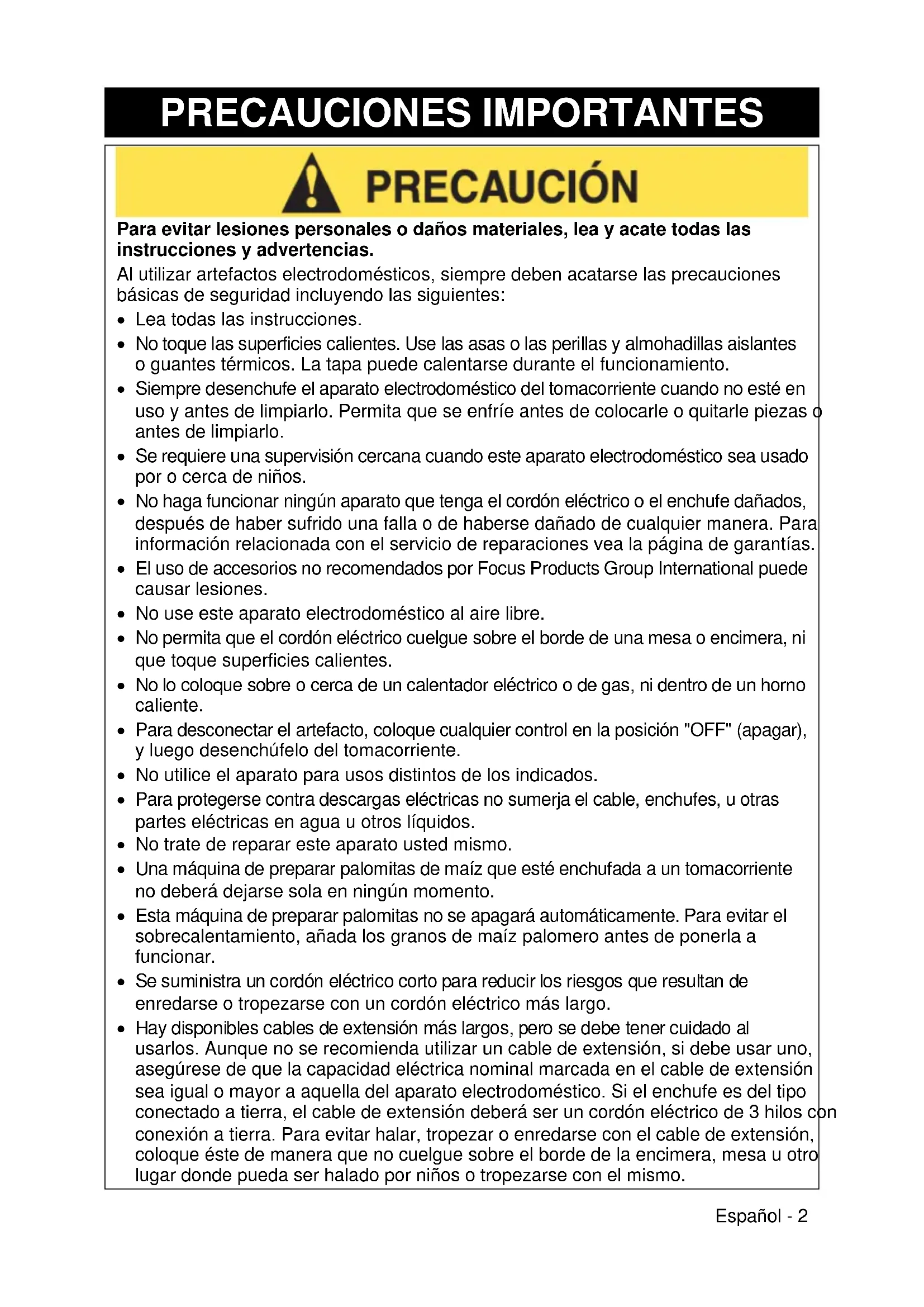 Para evitar lesiones personales o daños materiales, lea y acate todas las instrucciones y advertencias. Al utilizar artefactos electrodomésticos, siempre deben acatarse las precauciones básicas de seguridad incluyendo las siguientes: Lea todas las instrucciones. No toque las superficies calientes. Use las asas o las perillas y almohadillas aislantes o guantes térmicos. La tapa puede calentarse durante el funcionamiento. Siempre desenchufe el aparato electrodoméstico del tomacorriente cuando no esté en uso y antes de limpiarlo. Permita que se enfríe antes de colocarle o quitarle piezas o antes de limpiarlo. Se requiere una supervisión cercana cuando este aparato electrodoméstico sea usado por o cerca de niños. No haga funcionar ningún aparato que tenga el cordón eléctrico o el enchufe dañados, después de haber sufrido una falla o de haberse dañado de cualquier manera. Para información relacionada con el servicio de reparaciones vea la página de garantías. El uso de accesorios no recomendados por Focus Products Group International puede causar lesiones. No use este aparato electrodoméstico al aire libre. No permita que el cordón eléctrico cuelgue sobre el borde de una mesa o encimera, ni que toque superficies calientes. No lo coloque sobre o cerca de un calentador eléctrico o de gas, ni dentro de un horno caliente. Para desconectar el artefacto, coloque cualquier control en la posición "OFF" (apagar), y luego desenchúfelo del tomacorriente. No utilice el aparato para usos distintos de los indicados. Para protegerse contra descargas eléctricas no sumerja el cable, enchufes, u otras partes eléctricas en agua u otros líquidos. No trate de reparar este aparato usted mismo. Una máquina de preparar palomitas de maíz que esté enchufada a un tomacorriente no deberá dejarse sola en ningún momento. Esta máquina de preparar palomitas no se apagará automáticamente. Para evitar el sobrecalentamiento, añada los granos de maíz palomero antes de ponerla a funcionar. Se suministra un cordón eléctrico corto para reducir los riesgos que resultan de enredarse o tropezarse con un cordón eléctrico más largo. Hay disponibles cables de extensión más largos, pero se debe tener cuidado al usarlos. Aunque no se recomienda utilizar un cable de extensión, si debe usar uno, asegúrese de que la capacidad eléctrica nominal marcada en el cable de extensión sea igual o mayor a aquella del aparato electrodoméstico. Si el enchufe es del tipo conectado a tierra, el cable de extensión deberá ser un cordón eléctrico de 3 hilos con conexión a tierra. Para evitar halar, tropezar o enredarse con el cable de extensión, coloque éste de manera que no cuelgue sobre el borde de la encimera, mesa u otro lugar donde pueda ser halado por niños o tropezarse con el mismo.Español - 3 Este electrodoméstico tiene un enchufe polarizado (una clavija es más ancha que la otra). Para reducir el riesgo de una descarga eléctrica, este enchufe está diseñado para encajar de una sola manera dentro del tomacorriente polarizado. Invierta el enchufe si éste no encaja completamente en el tomacorriente o el cable de extensión. Si el enchufe todavía no encaja, consulte con un electricista calificado. No trate de modificar el enchufe de manera alguna. No use un tomacorriente o cable de extensión en el cual el enchufe calce flojamente, o si el tomacorriente o el cable de extensión se calientan. Mientras esté en uso, no retire la tapa. No retire la tapa del aparato después del ciclo de preparación de palomitas hasta tanto no haya oído reventar un grano de maíz durante por lo menos 1 minuto. Sólo para uso doméstico.