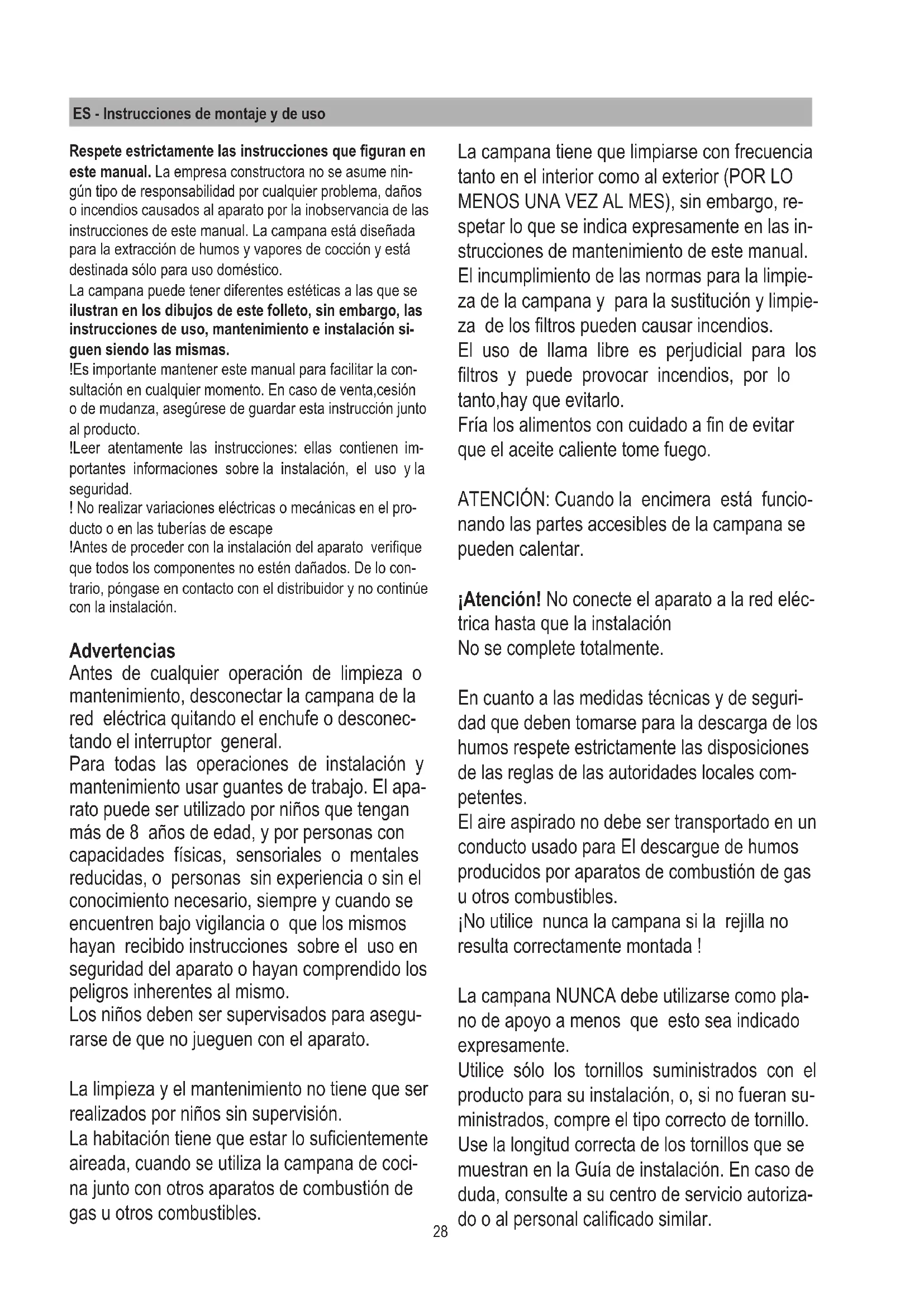 - Plaats de metalen doos met de elektronische componenten op een goed bereikbare plaats voor eventueel onderhoud en maak de elektri- sche verbindingen met de afzuigkap (Afb.11) Werking Voor de normale werking van het product moet de uitklapwagen als volgt worden opengeklapt. Duw het glas naar onder zoals op de Afb. 12. Het zal loskomen en zich openen. Zodra de uitklapwagen open is, kunt u de af- zuigmotor aan zetten met de bedieningen zoals hieronder is uitgelegd. Sluit het paneel op dezelfde manier. Druk op het glas totdat de wagen volledig is ingeklapt en gesloten. T1. T2. T3. Toets ON / OFF timer: indrukken om het automatisch uitschakelen te programmeren: Snelheid 1: 20 minuten Snelheid 2: 15 minuten Snelheid 3: 10 minuten Hoge Snelheid: 5 minuten Toets om de afzuigsnelheid (vermogen) te vermin- deren OFF 1: druk de toets enkele keren in om de snelheid te minderen totdat de afzuigkap uit valt. OFF 2: lang genoeg indrukken bij elke afzuigsnel- heid. Toets ON/hogere snelheid (afzuigvermogen) (1-2-3- Hoog). De hoge snelheid duurt ongeveer 5 minuten, waarna de kap automatisch overschakelt op de snelheid 2.27 Filterverzadigingswaarschuwing De afzuigkap waarschuwt als de lters onderhoud nodig hebben: Vetlter (ongeveer om de 40 draaiuren): alle lichtblauwe LEDS gaan branden Geurlter met actief koolstof (ongeveer om de 160 dra- aiuren): alle lichtblauwe LEDS gaan branden, het lampje L2 en L3 knipperen Reset lterverzadiging Als het onderhoud aan de lters gedaan is, drukt u de toet- sen T1 en T3 lang genoeg in. De lichtblauwe LEDS L1, L2 en L3 knipperen even en gaan dan uit. De waarschuwing voor de verzadiging van de actief- koolstoflter inschakelen Deze waarschuwingsfunctie is meestal uitgeschakeld. Schakel de waarschuwing als volgt in: Terwijl de kap uit staat, houdt u lang genoeg tegelijkertijd de toetsen T1 en T2 ingedrukt: eerst zal de LED L1 gaan branden en dan ook L2 en L3. Als u de LED-toetsen L2 en L3 loslaat, knipperen ze even om de inschakeling te bevestigen. Uitschakeling LED koolstoflterverzadiging: herhaal de hierboven beschreven procedure. Eerst gaan alle LEDS L1, L2 en L3 samen aan, waarna, als u de LED-toetsen L2 en L3 loslaat, ze uit gaan om de uitschakeling te bevestigen. ONDERHOUD Vetlter Houdt de vetdeeltjes tegen die door het koken vrijkomen. Deze lter moet een keer per maand worden gereinigd (of als het systeem voor de verzadiging van de lters waar- schuwt - indien voorzien voor het model), met zachte reini- gingsproducten, met de hand of in de vaatwasmachine met een korte cyclus en een lage watertemperatuur. De metalen vetlter kan in de vaatwasmachine verkleuren, maar dit wijzigt niets aan de lterkenmerken. Filter met actief koolstof (alleen voor de lteruitvoering): houdt onaangename geuren tegen. Het duurt vrij lang voordat de koolstoflter verzadigd raakt, afhankelijk van de kookapparatuur en de regelmaat waar- mee de vetlters worden gereinigd. In elk geval moet de vulling om de vier maanden worden vervangen. Als de vetlters zijn verwijderd, kunt u de koolstoflters pla- atsen (Afb. 8).28 ES - Instrucciones de montaje y de uso Respete estrictamente las instrucciones que guran en este manual. La empresa constructora no se asume nin- gún tipo de responsabilidad por cualquier problema, daños o incendios causados al aparato por la inobservancia de las instrucciones de este manual. La campana está diseñada para la extracción de humos y vapores de cocción y está destinada sólo para uso doméstico. La campana puede tener diferentes estéticas a las que se ilustran en los dibujos de este folleto, sin embargo, las instrucciones de uso, mantenimiento e instalación si- guen siendo las mismas. !Es importante mantener este manual para facilitar la con- sultación en cualquier momento. En caso de venta,cesión o de mudanza, asegúrese de guardar esta instrucción junto al producto. !Leer atentamente las instrucciones: ellas contienen im- portantes informaciones sobre la instalación, el uso y la seguridad. ! No realizar variaciones eléctricas o mecánicas en el pro- ducto o en las tuberías de escape !Antes de proceder con la instalación del aparato verique que todos los componentes no estén dañados. De lo con- trario, póngase en contacto con el distribuidor y no continúe con la instalación. Advertencias Antes de cualquier operación de limpieza o mantenimiento, desconectar la campana de la red eléctrica quitando el enchufe o desconec- tando el interruptor general. Para todas las operaciones de instalación y mantenimiento usar guantes de trabajo. El apa- rato puede ser utilizado por niños que tengan más de 8 años de edad, y por personas con capacidades físicas, sensoriales o mentales reducidas, o personas sin experiencia o sin el conocimiento necesario, siempre y cuando se encuentren bajo vigilancia o que los mismos hayan recibido instrucciones sobre el uso en seguridad del aparato o hayan comprendido los peligros inherentes al mismo. Los niños deben ser supervisados para asegu- rarse de que no jueguen con el aparato. La limpieza y el mantenimiento no tiene que ser realizados por niños sin supervisión. La habitación tiene que estar lo sucientemente aireada, cuando se utiliza la campana de coci- na junto con otros aparatos de combustión de gas u otros combustibles. La campana tiene que limpiarse con frecuencia tanto en el interior como al exterior (POR LO MENOS UNA VEZ AL MES), sin embargo, re- spetar lo que se indica expresamente en las in- strucciones de mantenimiento de este manual. El incumplimiento de las normas para la limpie- za de la campana y para la sustitución y limpie- za de los ltros pueden causar incendios. El uso de llama libre es perjudicial para los ltros y puede provocar incendios, por lo tanto,hay que evitarlo. Fría los alimentos con cuidado a n de evitar que el aceite caliente tome fuego. ATENCIÓN: Cuando la encimera está funcio- nando las partes accesibles de la campana se pueden calentar. ¡Atención! No conecte el aparato a la red e