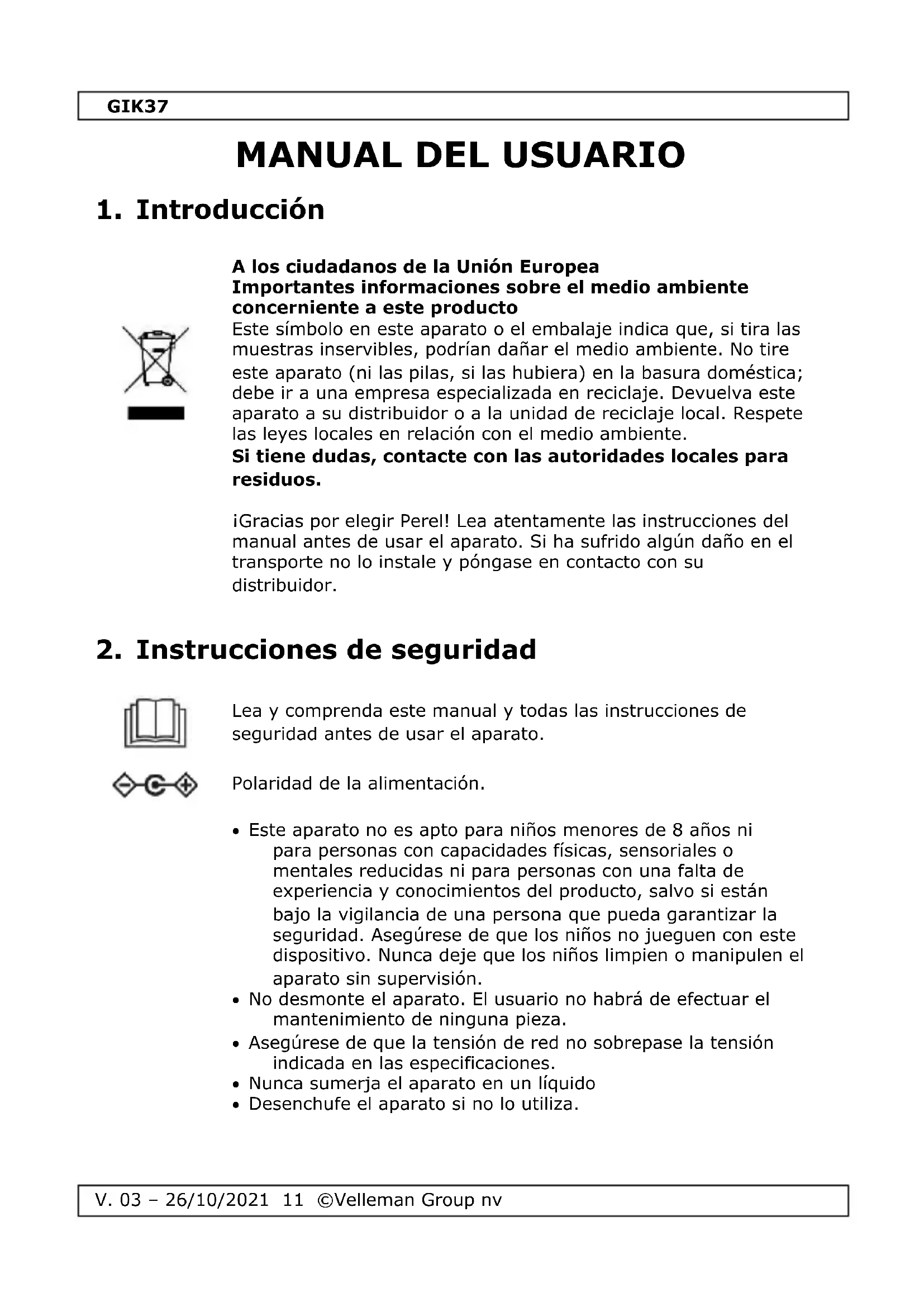 Velleman Group nv dispone de los derechos de autor para este manual del usuario. Todos los derechos mundiales reservados. Está estrictamente prohibido reproducir, traducir, copiar, editar y guardar este manual del usuario o partes de ello sin el consentimiento previo por escrito del propietario del copyright.GIK37