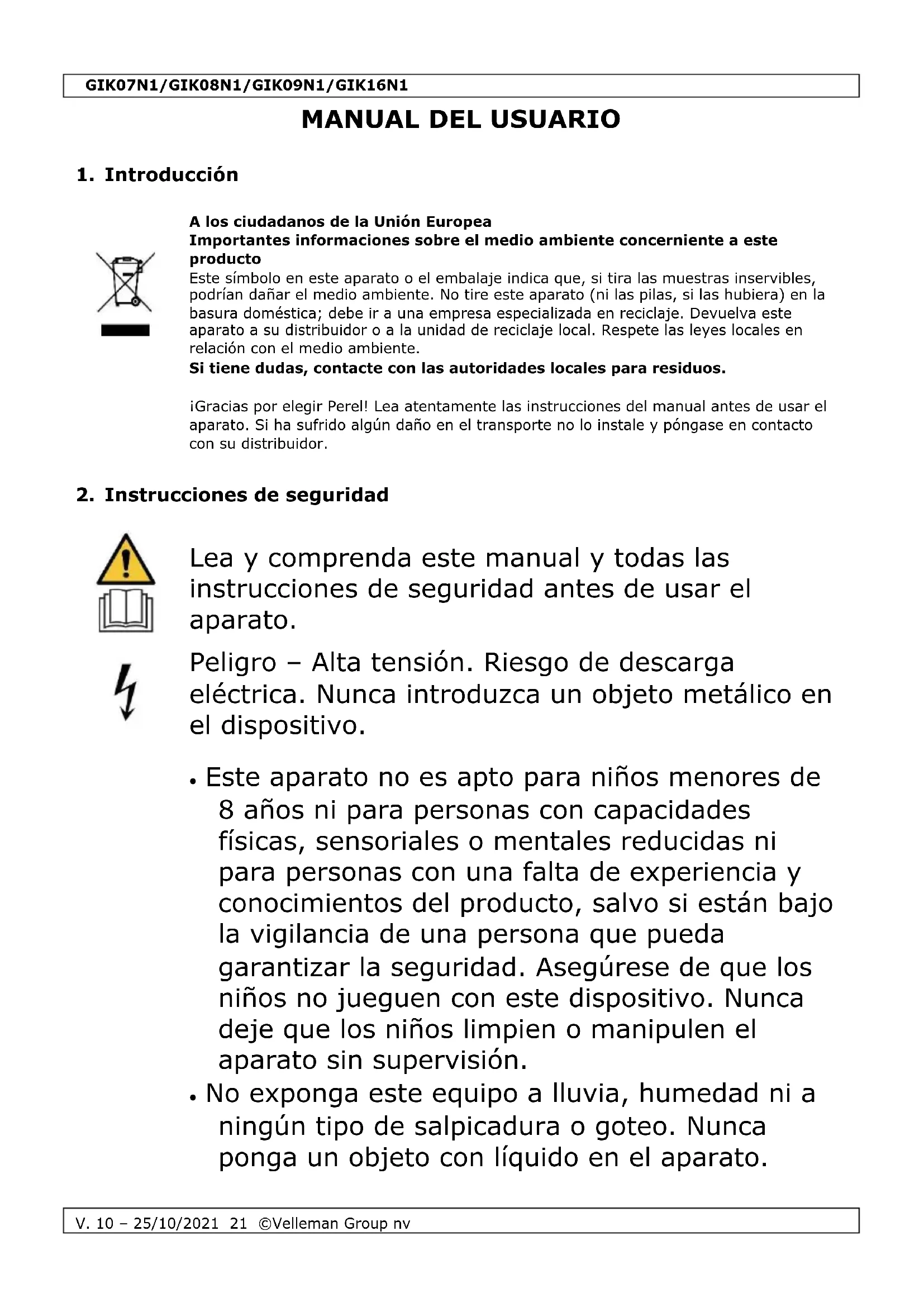 Velleman Group nv dispone de los derechos de autor para este manual del usuario. Todos los derechos mundiales reservados. Está estrictamente prohibido reproducir, traducir, copiar, editar y guardar este manual del usuario o partes de ello sin el consentimiento previo por escrito del propietario del copyright.GIK07N1/GIK08N1/GIK09N1/GIK16N1