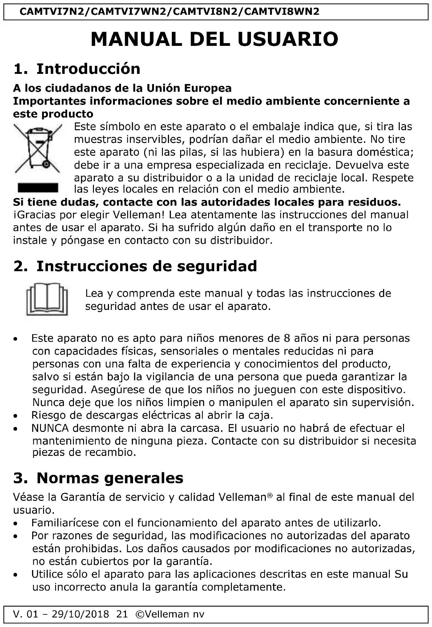 Este manual del usuario protegido por el derecho de autor. Velleman NV dispone de los derechos de autor para este manual del usuario. Todos los derechos mundiales reservados. Está estrictamente prohibido reproducir, traducir, copiar, editar y guardar este manual del usuario o partes de ello sin el consentimiento previo por escrito del propietario del copyright.CAMTVI7N2/CAMTVI7WN2/CAMTVI8N2/CAMTVI8WN2