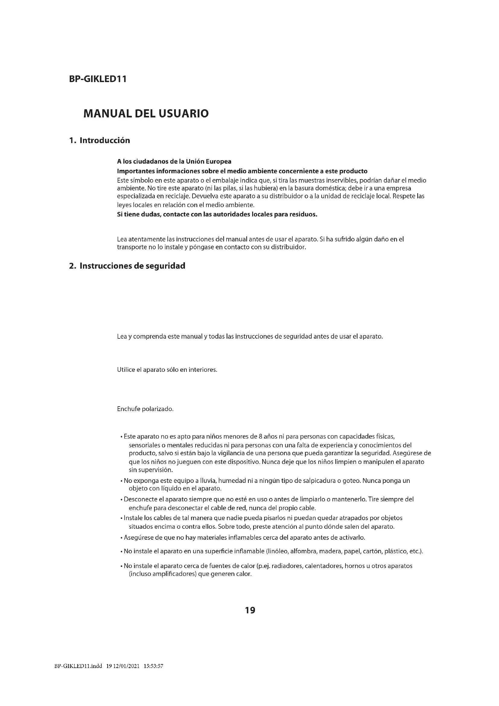 - No instale el aparato cerca de fuentes de calor (p.ej. radiadores, calentadores, hornos u otros aparatos (incluso amplicadores) que generen calor. BP-GIKLED11.indd 19 12/01/2021 15:53:57BP-GIKLED11