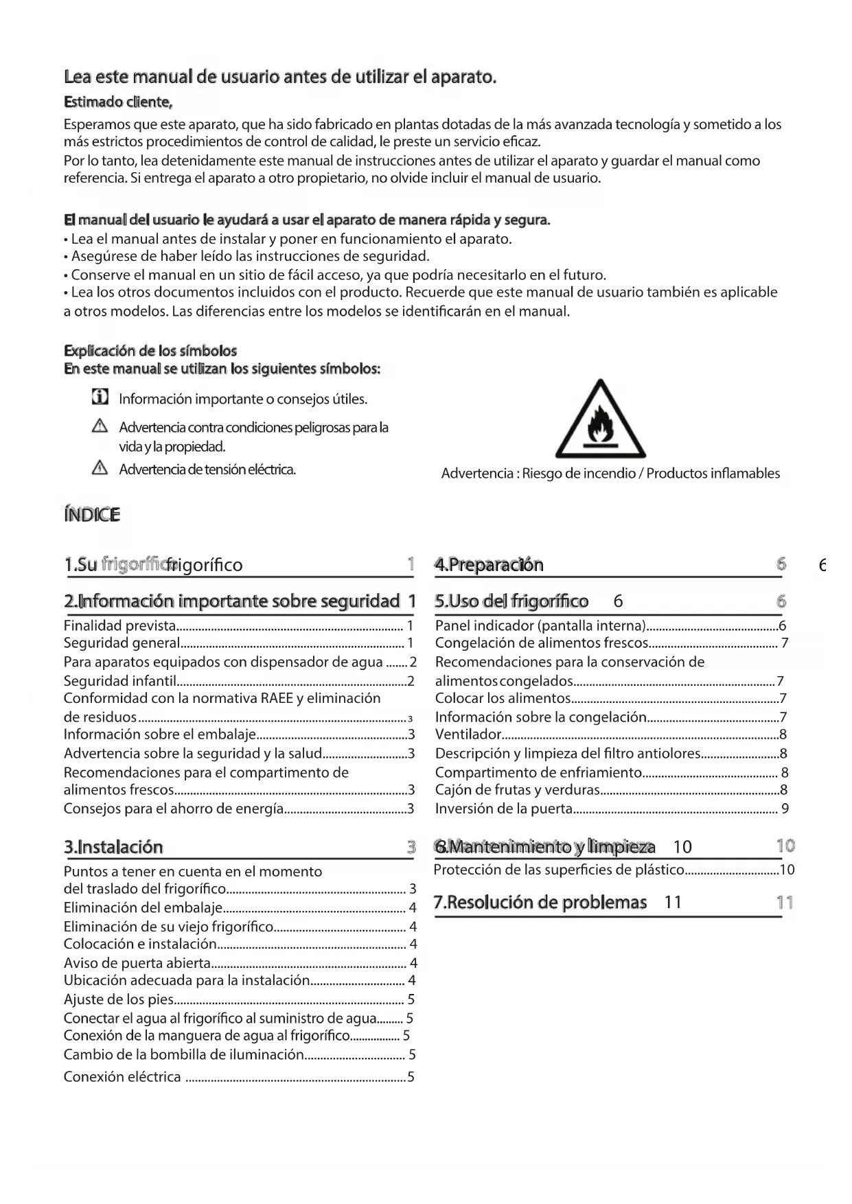 6.Mantenimiento y limpieza 10 Protección de las supercies de plástico..............................10 7.Resolución de problemas 11 Advertencia : Riesgo de incendio / Productos inamablesES