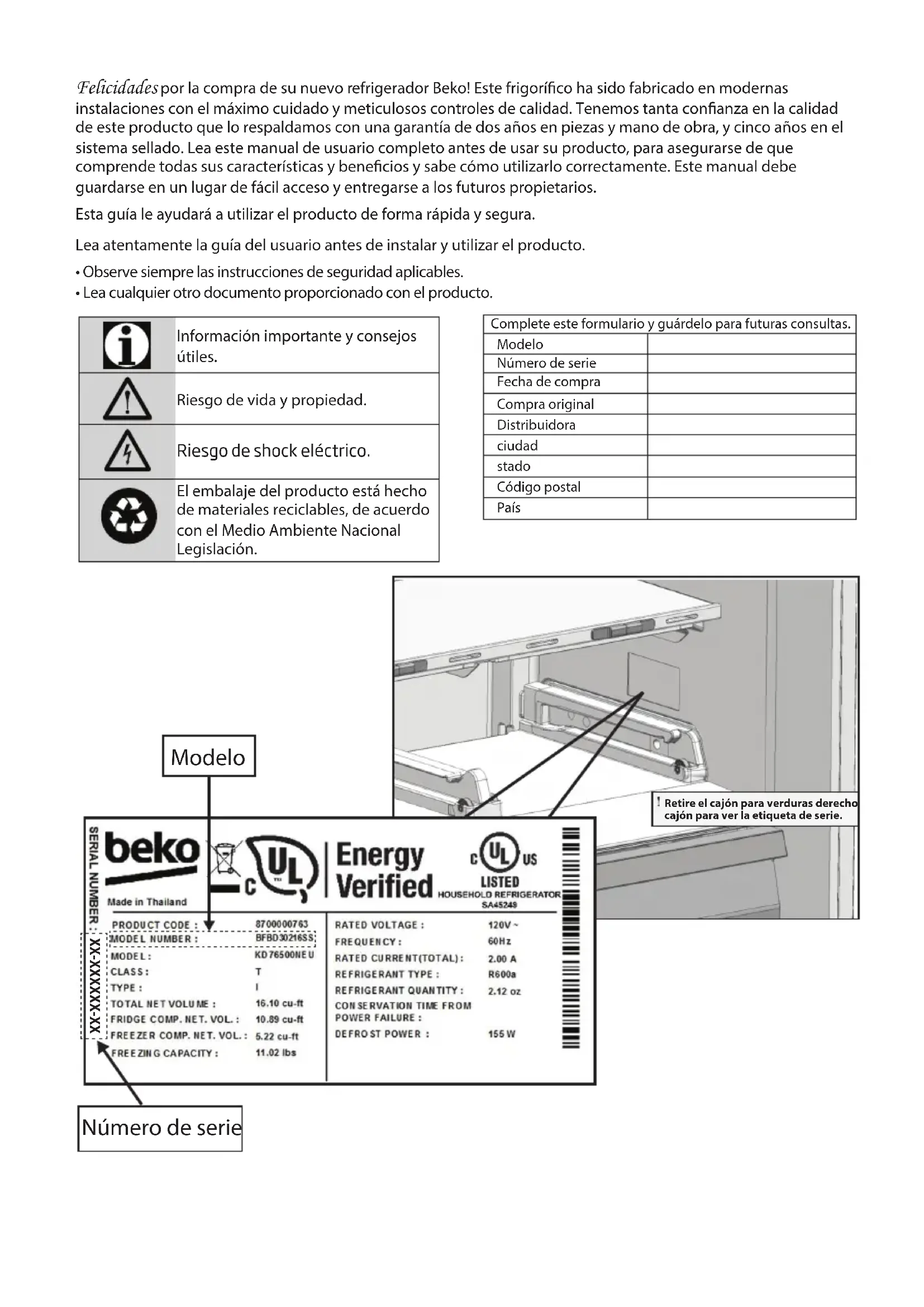- Lea cualquier otro documento proporcionado con el producto. Información importante y consejos útiles. El embalaje del producto está hecho de materiales reciclables, de acuerdo con el Medio Ambiente Nacional Legislación. Número de serie Modelo Riesgo de vida y propiedad. Riesgo de shock eléctrico. Esta guía le ayudará a utilizar el producto de forma rápida y segura. Lea atentamente la guía del usuario antes de instalar y utilizar el producto. Complete este formulario y guárdelo para futuras consultas. Modelo Número de serie Fecha de compra Compra original Distribuidora ciudad stado Código postal País XX-XXXXXX-XX Retire el cajón para verduras derechocajón para ver la etiqueta de serie.Contenido ¡Lea primero la sección "Instrucciones de seguridad"! El fabricante no será responsable de ningún evento causado por no tener en cuenta la información proporcionada en este manual de usuario.