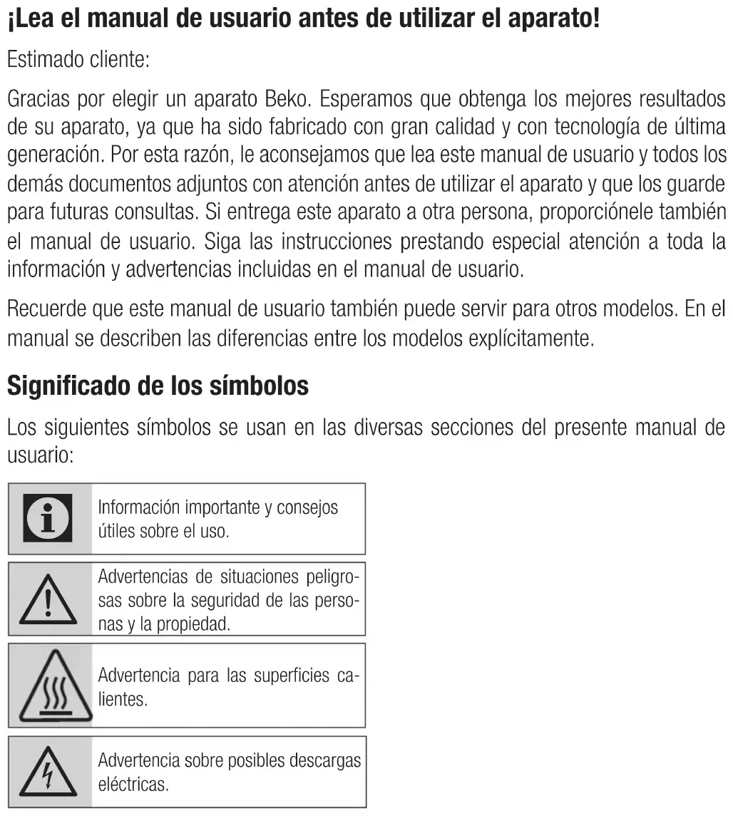 - záruka se nevztahuje na návštěvu technika za účelem poradenství, preventivní kontrolu stavu spotřebiče, výměnu náhradního dílu, který nevyžaduje odborný zásah, záměna směru otvírání dveří chladniček¡Lea el manual de usuario antes de utilizar el aparato! Estimado cliente: Gracias por elegir un aparato Beko. Esperamos que obtenga los mejores resultados de su aparato, ya que ha sido fabricado con gran calidad y con tecnología de última generación. Por esta razón, le aconsejamos que lea este manual de usuario y todos los demás documentos adjuntos con atención antes de utilizar el aparato y que los guarde para futuras consultas. Si entrega este aparato a otra persona, proporciónele también el manual de usuario. Siga las instrucciones prestando especial atención a toda la información y advertencias incluidas en el manual de usuario. Recuerde que este manual de usuario también puede servir para otros modelos. En el manual se describen las diferencias entre los modelos explícitamente. Significado de los símbolos Los siguientes símbolos se usan en las diversas secciones del presente manual de usuario: