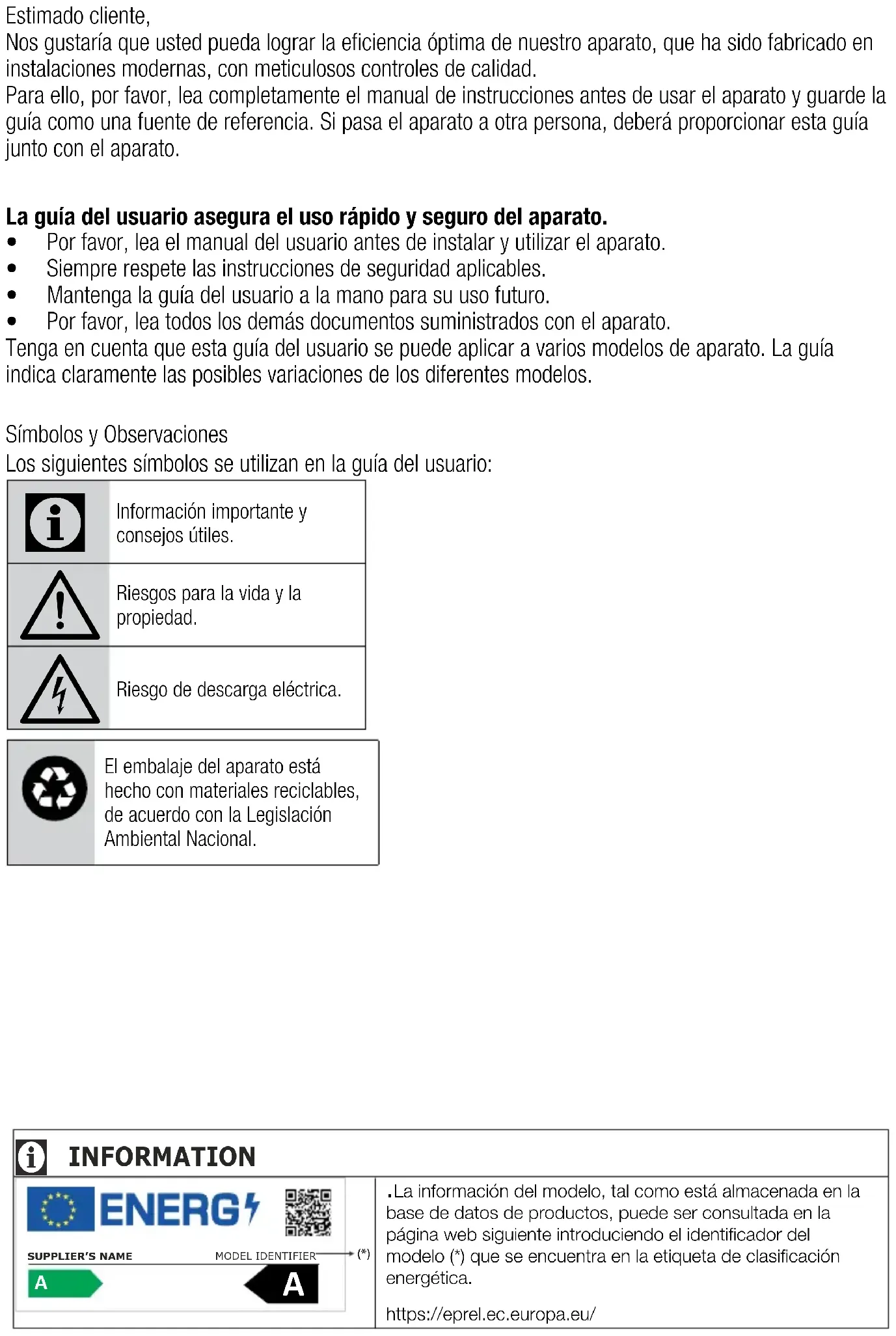 Información importante y consejos útiles. Riesgos para la vida y la propiedad. Riesgo de descarga eléctrica.El embalaje del aparato está hecho con materiales reciclables, de acuerdo con la Legislación Ambiental Nacional. .La información del modelo, tal como está almacenada en la base de datos de productos, puede ser consultada en la página web siguiente introduciendo el identificador del modelo (*) que se encuentra en la etiqueta de clasificación energética.https://eprel.ec.europa.eu/