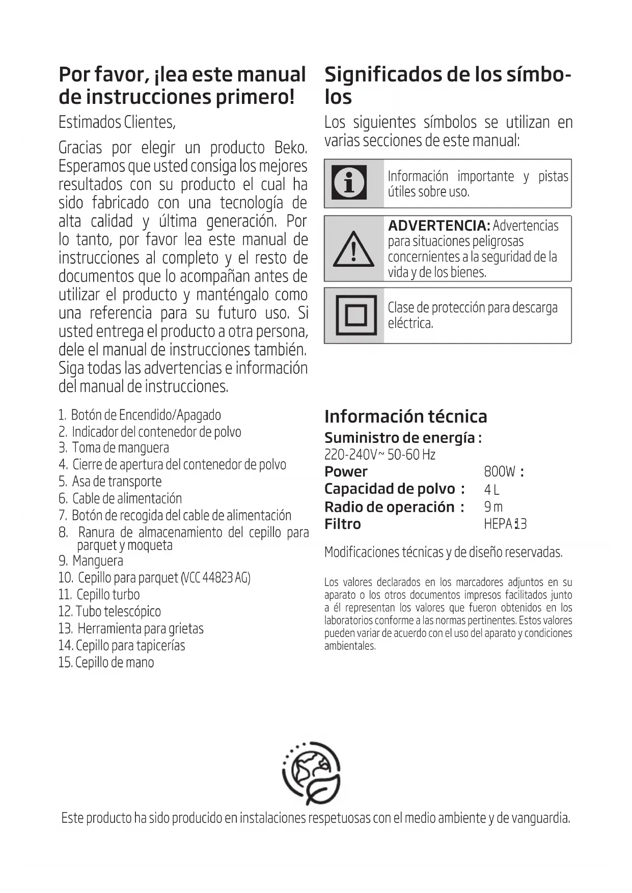 Información técnica Suministro de energía : 220-240V~ 50-60 Hz Power : 800W Capacidad de polvo : 4 L Radio de operación : 9 m Filtro : HEPA 13 Modificaciones técnicas y de diseño reservadas. Los valores declarados en los marcadores adjuntos en su aparato o los otros documentos mpresos facltados junto a él representan los valores que fueron obtendos en los laboratoros conforme a las normas pertnentes. Estos valores pueden varar de acuerdo con el uso del aparato y condcones ambentales.24 / ES Aspiradora / Manual de instrucciones