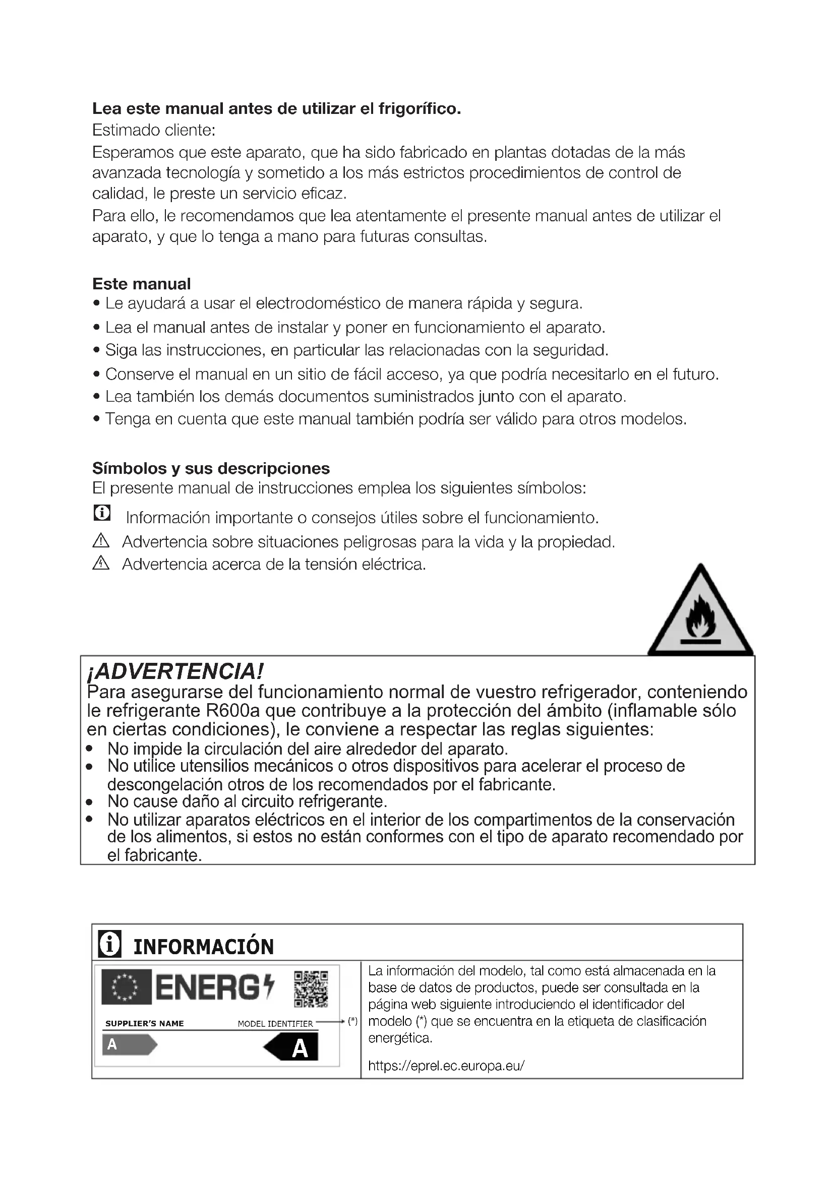 Información importante o consejos útiles sobre el funcionamiento. A Advertencia sobre situaciones peligrosas para la vida y la propiedad. B Advertencia acerca de la tensión eléctrica. ¡ADVERTENCIA! Para asegurarse del funcionamiento normal de vuestro refrigerador, conteniendo le refrigerante R600a que contribuye a la protección del ámbito (inflamable sólo en ciertas condiciones), le conviene a respectar las reglas siguientes: