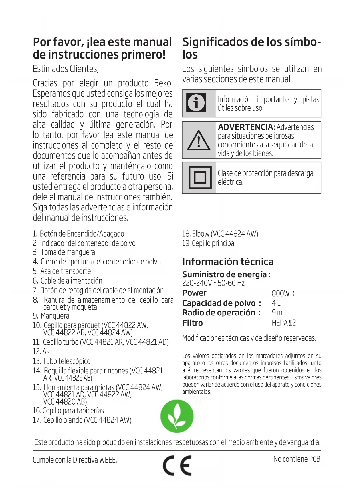 VCC 44822 AW - Aspiradora BEKO - Manual de uso y guía de instrucciones gratis