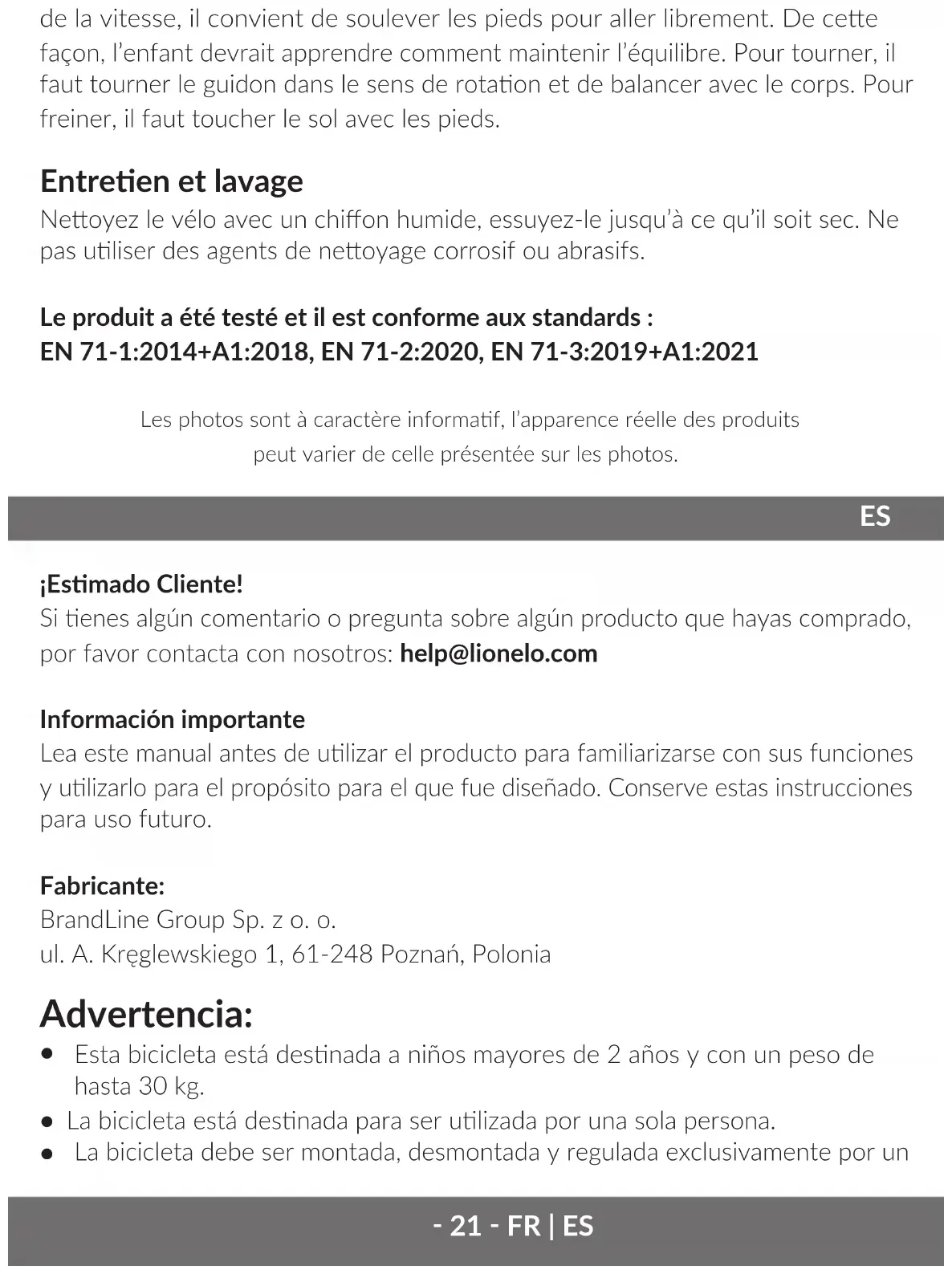Presta atención a la dirección de la banda de rodadura de la rueda delantera, debe coincidir con la dirección de la banda de rodadura de la rueda trasera. Coloca la rueda en la horquilla deslizando uno de los extremos del buje en el oricio correspondiente, repite este proceso en el otro lado. ¡Evita la inclinación excesiva de la horquilla! Aprieta el buje a la horquilla con los tornillos. La parte de la arandela que presenta surcos debe estar en el lado del cuadro de la bicicleta.‑ 24 ‑ES | NL Uso Es necesario sentarse en el sillín, agarrar rmemente ambos mangos y, a connuación, empujar hacia atrás con los pies alternavamente en el suelo. Al coger impulso, es necesario levantar los pies para avanzar libremente. De este modo, el niño debe aprender cómo mantener el equilibrio. El giro se realiza girando el manillar hacia la dirección deseada y equilibrando el cuerpo. Para frenar se debe hacer contacto en el suelo con los pies. Mantenimiento y limpieza Limpiar la bicicleta con un paño húmedo y luego secarla. No ulice limpiadores corrosivos o abrasivos para limpiar el producto. El producto ha sido probado y cumple con las normas: EN 71-1:2014+A1:2018, EN 71-2:2020, EN 71-3:2019+A1:2021 Las fotos solo enen carácter ilustravo, el aspecto real de los productos puede diferir del presentado en las fotos. Beste Klant! Als u opmerkingen of vragen hee over het gekochte product, neem dan contact met ons op: help@lionelo.com Belangrijke informae Lees deze handleiding voordat u het product in gebruik neemt, zodat u vertrouwd raakt met de funces van het product en het kunt gebruiken waarvoor het bedoeld is. Bewaar deze instruces voor toekomsg gebruik. Fabrikant: BrandLine Group Sp. z o. o. ul. A. Kręglewskiego 1, 61-248 Poznań, Polen Waarschuwingen: