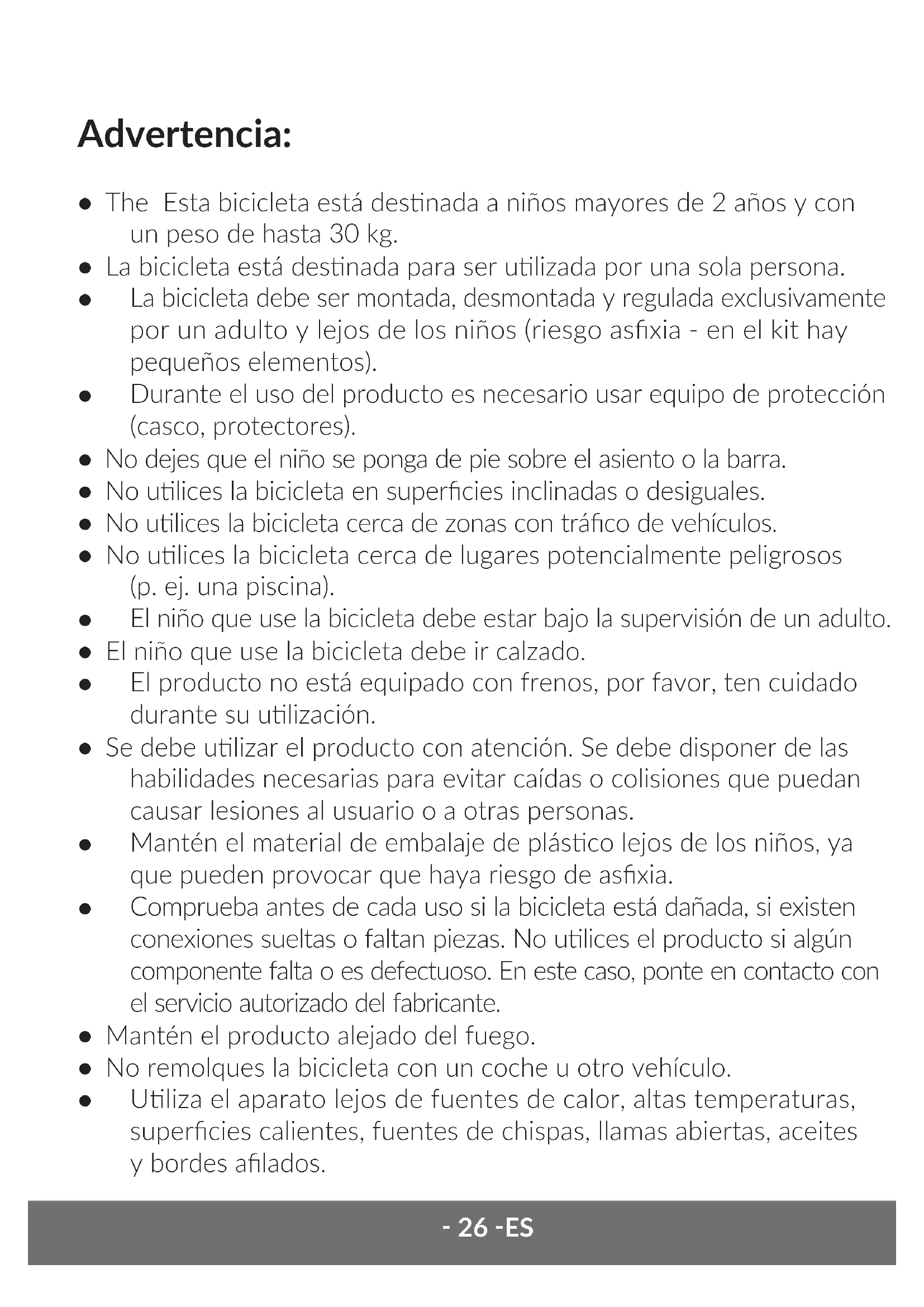 - The Esta bicicleta está desnada a niños mayores de 2 años y con un peso de hasta 30 kg.
