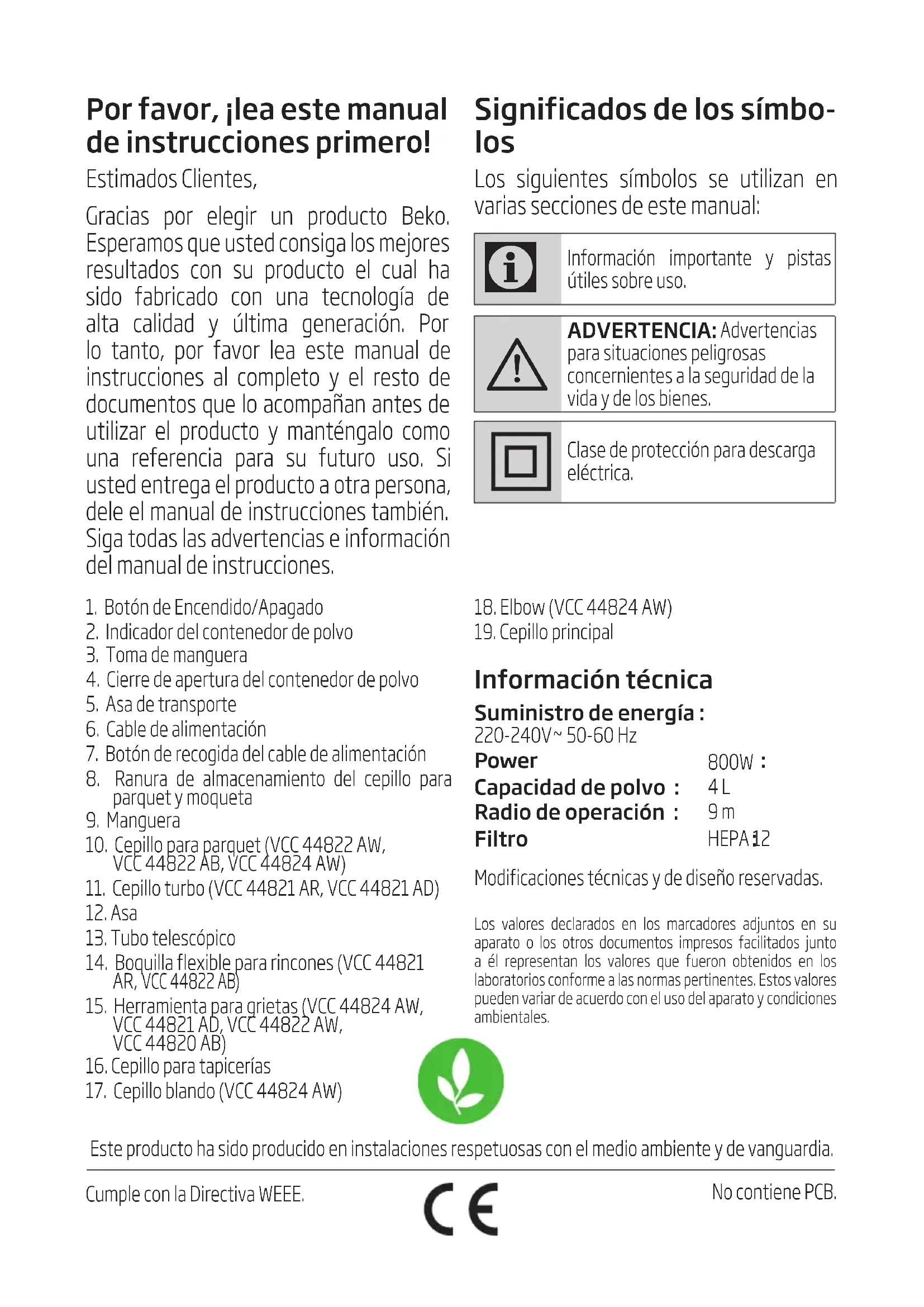 - Si vous ne comptez pas utiliser votre appareil pendant une période prolongée, veuillez le ranger soigneusement. • Retirez la fiche débranchez-le. • Tenez l’appareil hors de la portée des enfants.Por favor, ¡lea este manual de instrucciones primero! Estimados Clientes, Gracias por elegir un producto Beko. Esperamos que usted consiga los mejores resultados con su producto el cual ha sido fabricado con una tecnología de alta calidad y última generación. Por lo tanto, por favor lea este manual de instrucciones al completo y el resto de documentos que lo acompañan antes de utilizar el producto y manténgalo como una referencia para su futuro uso. Si usted entrega el producto a otra persona, dele el manual de instrucciones también. Siga todas las advertencias e información del manual de instrucciones. Este producto ha sdo producdo en nstalacones respetuosas con el medo ambente y de vanguarda. Cumple con la Drectva WEEE. No contene PCB. Significados de los símbo- los Los siguientes símbolos se utilizan en varias secciones de este manual: