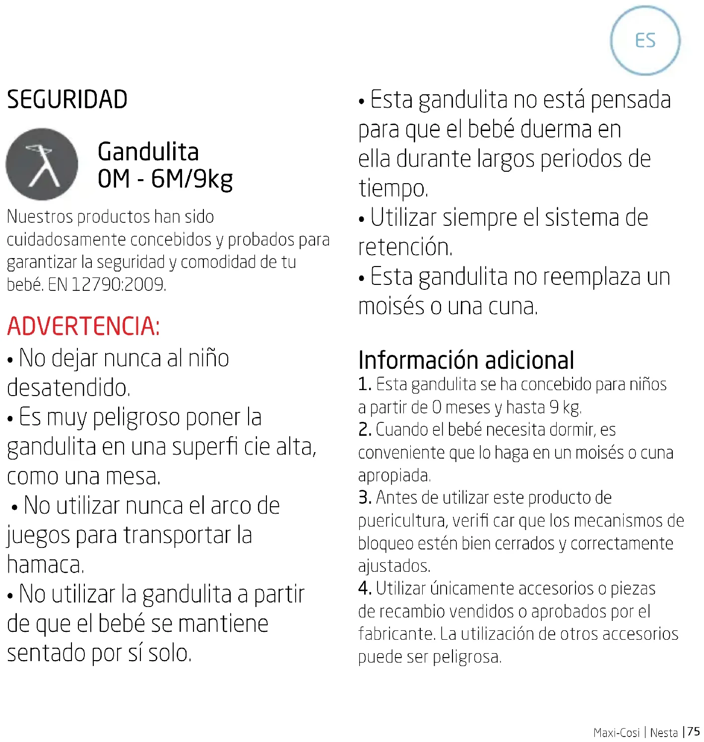 SEGURIDAD Gandulita 0M - 6M/9kg Nuestros productos han sido cuidadosamente concebidos y probados para garantizar la seguridad y comodidad de tu bebé. EN 12790:2009. ADVERTENCIA: