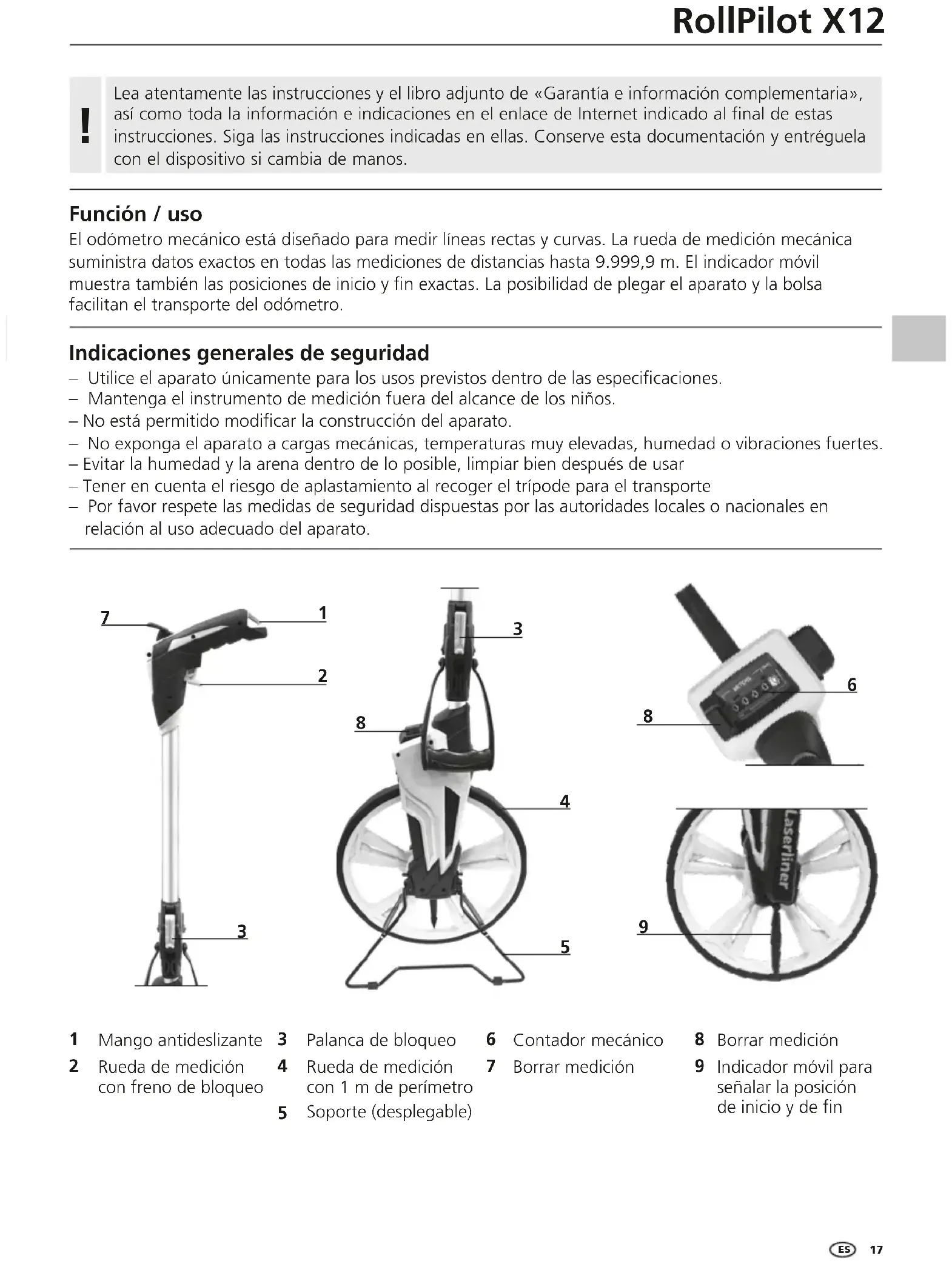 Función / uso El odómetro mecánico está diseñado para medir líneas rectas y curvas. La rueda de medición mecánica suministra datos exactos en todas las mediciones de distancias hasta 9.999,9 m. El indicador móvil muestra también las posiciones de inicio y n exactas. La posibilidad de plegar el aparato y la bolsa facilitan el transporte del odómetro. Indicaciones generales de seguridad – Utilice el aparato únicamente para los usos previstos dentro de las especicaciones. – Mantenga el instrumento de medición fuera del alcance de los niños. – No está permitido modicar la construcción del aparato. – No exponga el aparato a cargas mecánicas, temperaturas muy elevadas, humedad o vibraciones fuertes. – Evitar la humedad y la arena dentro de lo posible, limpiar bien después de usar – Tener en cuenta el riesgo de aplastamiento al recoger el trípode para el transporte – Por favor respete las medidas de seguridad dispuestas por las autoridades locales o nacionales en relación al uso adecuado del aparato.