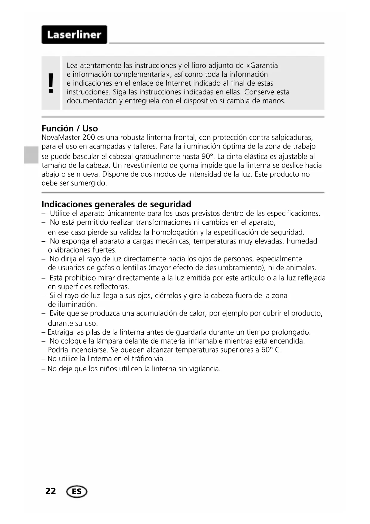 Réglementation UE et élimination des déchets L‘appareil est conforme à toutes les normes nécessaires pour la libre circulation des marchandises dans l‘Union européenne.Ce produit est un appareil électrique et doit donc faire l‘objet d‘une collecte et d‘une mise au rebut sélectives conformément à la directive européenne sur les anciens appareils électriques et électroniques (directive DEEE).Autres remarques complémentaires et consignes de sécurité sur www.laserliner.com/info Remarques concernant la maintenance et l‘entretien Nettoyer tous les composants avec un chiffon légèrement humide et éviter d‘utiliser des produits de nettoyage, des produits à récurer ou des solvants. Retirer la/les pile(s) avant tout stockage prolongé de l‘appareil. Stocker l‘appareil à un endroit sec et propre. Données techniques (Sous réserve de modications techniques. 21W04)Intensité lumineuse High / Low 200 / 100 lmAutonomie High / Low 6 / 12 hPuce à LED Osram SMT3528Classe de protection IP 54Alimentation électrique AAA Ni-MH 1,2 V / AAA Alkaline 1,5 VConditions de travail -22°… 65°Conditions de stockage -30°… 65°Longueur totale 37 mmPoids total 100 g FR22 Indicaciones generales de seguridad – Utilice el aparato únicamente para los usos previstos dentro de las especificaciones. – No está permitido realizar transformaciones ni cambios en el aparato, en ese caso pierde su validez la homologación y la especificación de seguridad. – No exponga el aparato a cargas mecánicas, temperaturas muy elevadas, humedad o vibraciones fuertes. – No dirija el rayo de luz directamente hacia los ojos de personas, especialmente de usuarios de gafas o lentillas (mayor efecto de deslumbramiento), ni de animales. – Está prohibido mirar directamente a la luz emitida por este artículo o a la luz reejada en supercies reectoras. – Si el rayo de luz llega a sus ojos, ciérrelos y gire la cabeza fuera de la zona de iluminación. – Evite que se produzca una acumulación de calor, por ejemplo por cubrir el producto, durante su uso. – Extraiga las pilas de la linterna antes de guardarla durante un tiempo prolongado. – No coloque la lámpara delante de material inamable mientras está encendida. Podría incendiarse. Se pueden alcanzar temperaturas superiores a 60° C. – No utilice la linterna en el tráco vial. – No deje que los niños utilicen la linterna sin vigilancia. Función / Uso NovaMaster 200 es una robusta linterna frontal, con protección contra salpicaduras, para el uso en acampadas y talleres. Para la iluminación óptima de la zona de trabajo se puede bascular el cabezal gradualmente hasta 90°. La cinta elástica es ajustable al tamaño de la cabeza. Un revestimiento de goma impide que la linterna se deslice hacia abajo o se mueva. Dispone de dos modos de intensidad de la luz. Este producto no debe ser sumergido. Lea atentamente las instrucciones y el libro adjunto de «Garantía e información complementaria», así como toda la información e indicaciones en el enlace de Internet indicado al final de estas instrucciones. Siga las instrucciones indicadas en ellas. Conserve esta documentación y entréguela con el dispositivo si cambia de manos.