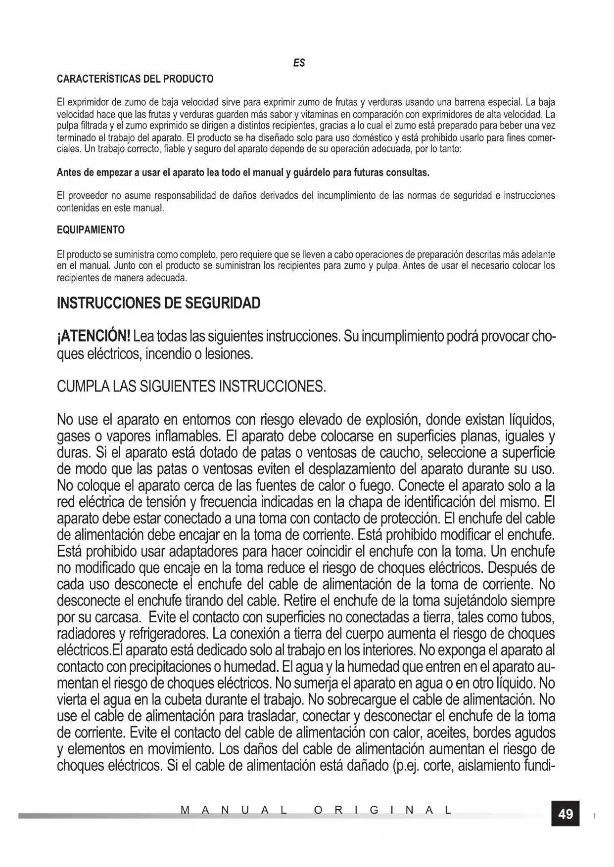 El exprimidor de zumo de baja velocidad sirve para exprimir zumo de frutas y verduras usando una barrena especial. La baja velocidad hace que las frutas y verduras guarden más sabor y vitaminas en comparación con exprimidores de alta velocidad. La pulpa fi ltrada y el zumo exprimido se dirigen a distintos recipientes, gracias a lo cual el zumo está preparado para beber una vez terminado el trabajo del aparato. El producto se ha diseñado solo para uso doméstico y está prohibido usarlo para fi nes comer- ciales. Un trabajo correcto, fi able y seguro del aparato depende de su operación adecuada, por lo tanto: Antes de empezar a usar el aparato lea todo el manual y guárdelo para futuras consultas. El proveedor no asume responsabilidad de daños derivados del incumplimiento de las normas de seguridad e instrucciones contenidas en este manual. EQUIPAMIENTO El producto se suministra como completo, pero requiere que se lleven a cabo operaciones de preparación descritas más adelante en el manual. Junto con el producto se suministran los recipientes para zumo y pulpa. Antes de usar el necesario colocar los recipientes de manera adecuada.