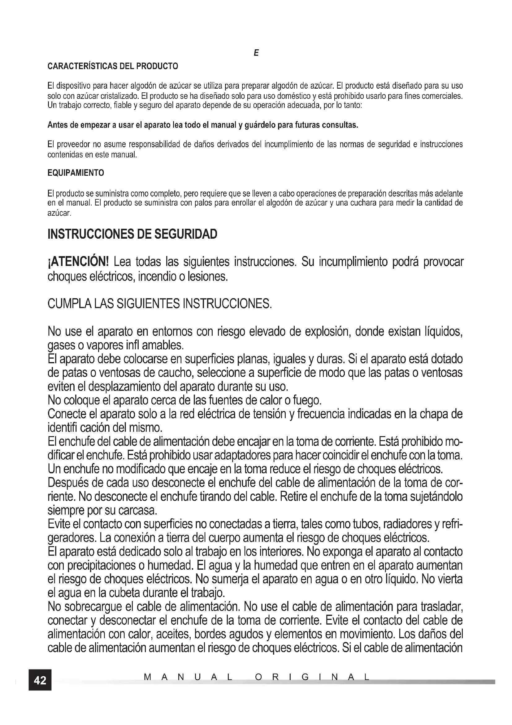 El dispositivo para hacer algodón de azúcar se utiliza para preparar algodón de azúcar. El producto está diseñado para su uso solo con azúcar cristalizado. El producto se ha diseñado solo para uso doméstico y está prohibido usarlo para fi nes comerciales. Un trabajo correcto, fi able y seguro del aparato depende de su operación adecuada, por lo tanto: Antes de empezar a usar el aparato lea todo el manual y guárdelo para futuras consultas. El proveedor no asume responsabilidad de daños derivados del incumplimiento de las normas de seguridad e instrucciones contenidas en este manual. EQUIPAMIENTO El producto se suministra como completo, pero requiere que se lleven a cabo operaciones de preparación descritas más adelante en el manual. El producto se suministra con palos para enrollar el algodón de azúcar y una cuchara para medir la cantidad de azúcar.
