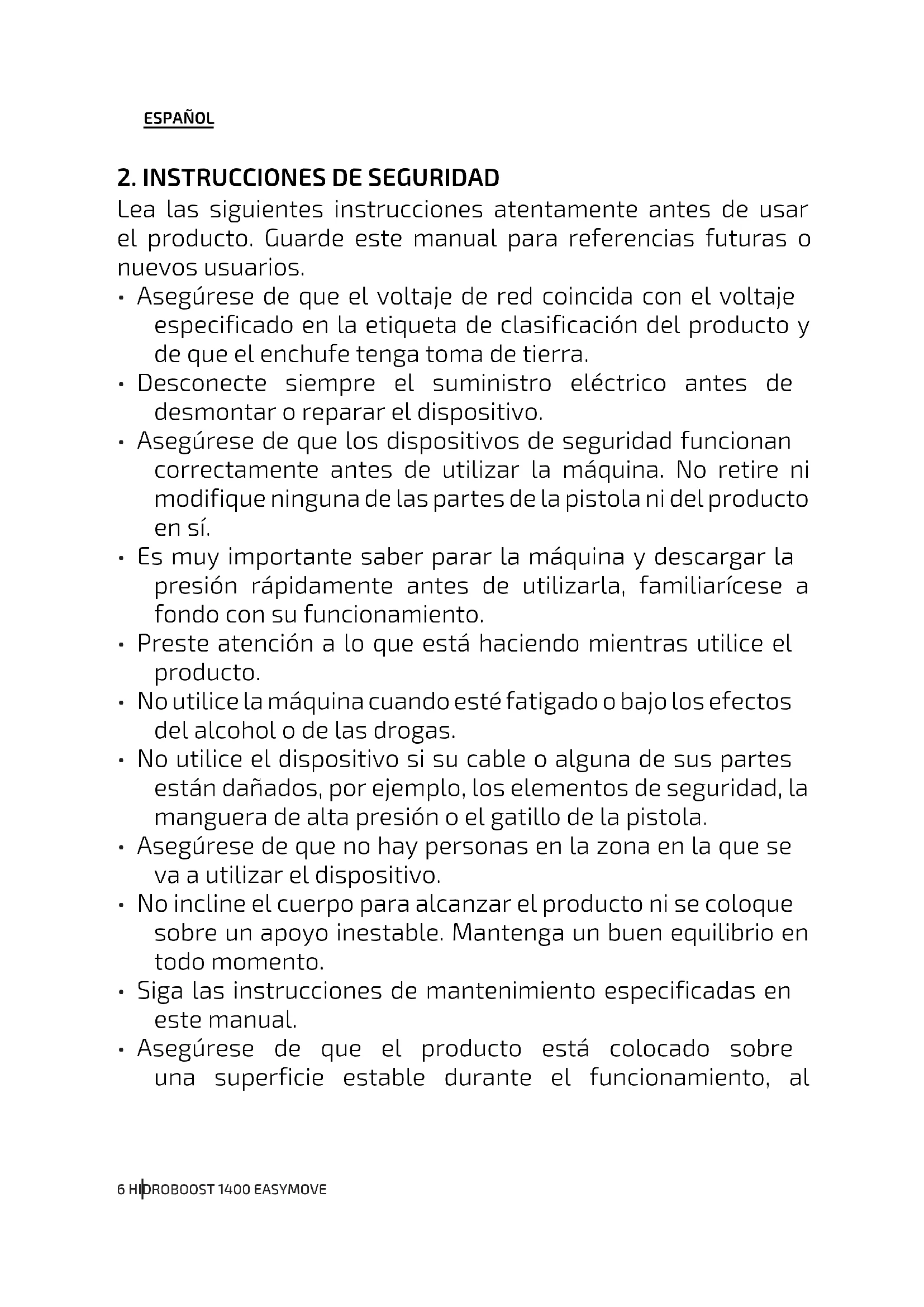 - Asegúrese de que el producto está colocado sobre una superficie estable durante el funcionamiento, al7 HIDROBOOST 1400 EASYMOVE ESPAÑOL transportarlo, montarlo o desmontarlo. Tenga cuidado al moverlo de un sitio a otro para evitar dañarlo.