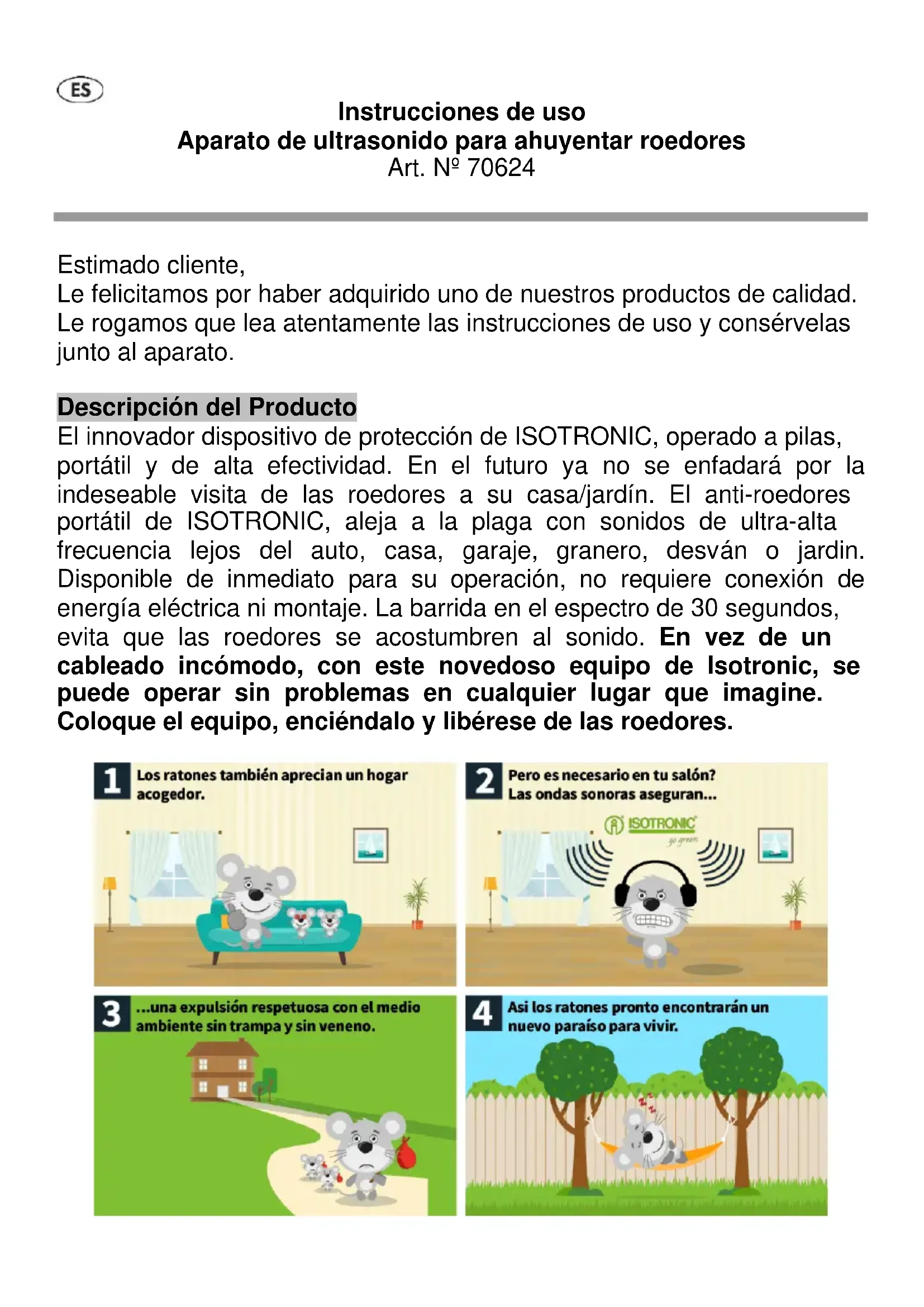 Estimado cliente, Le felicitamos por haber adquirido uno de nuestros productos de calidad. Le rogamos que lea atentamente las instrucciones de uso y consérvelas junto al aparato. Descripción del Producto El innovador dispositivo de protección de ISOTRONIC, operado a pilas, portátil y de alta efectividad. En el futuro ya no se enfadará por la indeseable visita de las roedores a su casa/jardín. El anti-roedores portátil de ISOTRONIC, aleja a la plaga con sonidos de ultra-alta frecuencia lejos del auto, casa, garaje, granero, desván o jardin. Disponible de inmediato para su operación, no requiere conexión de energía eléctrica ni montaje. La barrida en el espectro de 30 segundos, evita que las roedores se acostumbren al sonido. En vez de un cableado incómodo, con este novedoso equipo de Isotronic, se puede operar sin problemas en cualquier lugar que imagine. Coloque el equipo, enciéndalo y libérese de las roedores.Para alejar a los animales de forma permanente y también para mantenerlos alejados, el dispositivo debe estar en uso continuo y se debe aplicar un poco de paciencia. Nuestros dispositivos funcionan con frecuencias de umbral ultra altas que evitan la habituación y son molestos para los animales pero no necesariamente dolorosos. Dependiendo de la especie, a veces puede tomar hasta 3 semanas para que los animales abandonen su entorno familiar y noten un cambio. Los diferentes tipos de animales reaccionan de manera diferente, dependiendo de la edad, la raza y el tamaño, pero la mayoría de ellos tarde o temprano se sienten perturbados en sus hábitos y hábitos y abandonarán el área de forma permanente. Importante: la colocación del equipo puede ser crítica para su efectividad. Alinee los dispositivos con el "altavoz" directamente en una línea en los lugares para sentarse y descansar de los animales. Las frecuencias se envían en forma de embudo y el área a proteger debe estar dentro de este embudo. Una desalineación puede conducir a puntos ciegos en los que los animales pasan más tiempo para evitar las frecuencias perturbadoras. Es posible la fijación con el fijador de cables suministrado o bien con tornillos. La autonomía depende de las pilas y es aproximadamente de 12 meses. Funcionamiento Mínimo consumo mediante nueva tecnología electrónica. El equipo emite sonidos de alta frecuencia en intervalos de 30 segundos de duración (25 segundos de pausa). Estos sonidos, apenas perceptibles por el oído humano, alejan a las roedores. Tenga en cuenta que el aparato se puede iniciar en modo pausa y a continuación se pone en funcionamiento. No se trata de una avería. Datos Técnicos Operación a Pilas: 4 pilas x C Baby (no contenidas) Campo de acción: aprox. 40 m² (en espacios cerrados) Frecuencia: 12 - 24 kHz +/- 10% Frecuencia de Salida: Cíclico (cada 5 seg. Prendido y 25 seg. Apagado) Señalización: Indicación por LED (Cíclico) Accesorios de Fijación: Fijadores de CablesAdvertencias generales