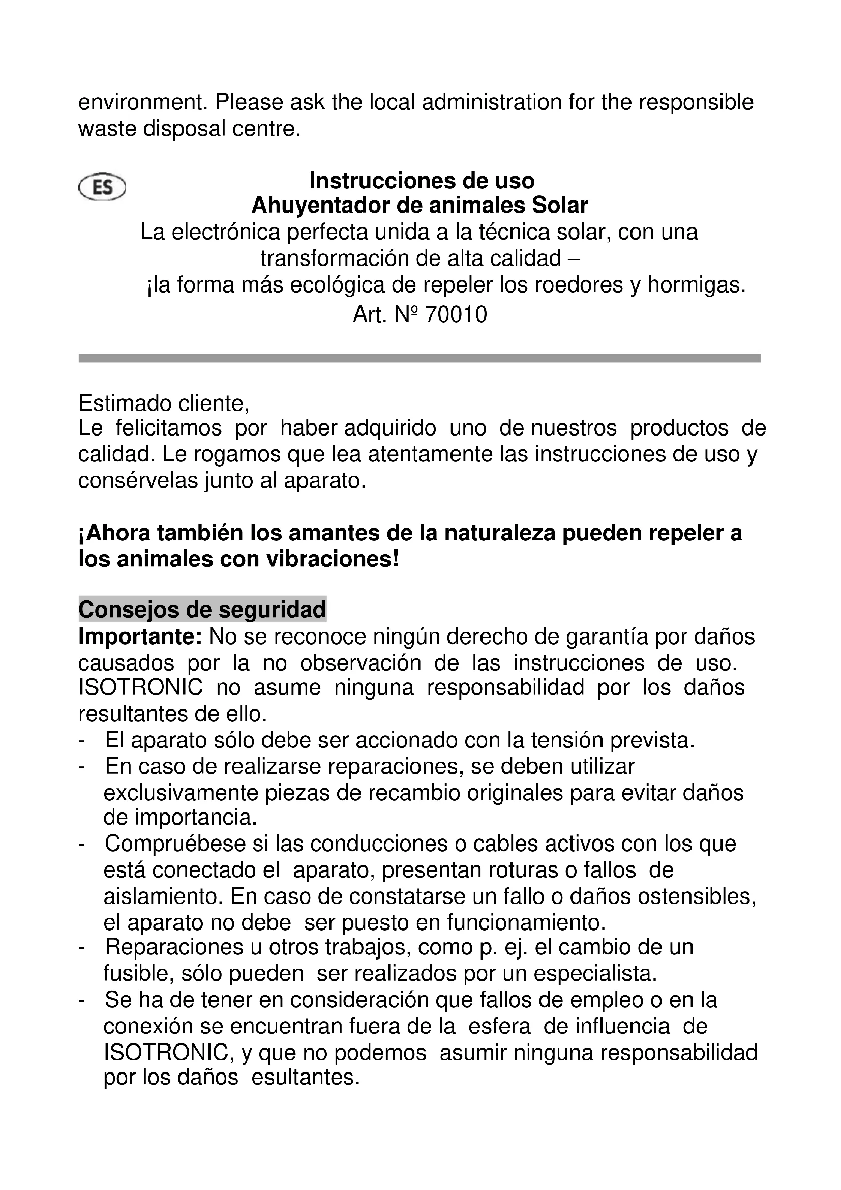 Estimado cliente, Le felicitamos por haber adquirido uno de nuestros productos de calidad. Le rogamos que lea atentamente las instrucciones de uso y consérvelas junto al aparato. ¡Ahora también los amantes de la naturaleza pueden repeler a los animales con vibraciones! Consejos de seguridad Importante: No se reconoce ningún derecho de garantía por daños causados por la no observación de las instrucciones de uso. ISOTRONIC no asume ninguna responsabilidad por los daños resultantes de ello. - El aparato sólo debe ser accionado con la tensión prevista. - En caso de realizarse reparaciones, se deben utilizar exclusivamente piezas de recambio originales para evitar daños de importancia. - Compruébese si las conducciones o cables activos con los que está conectado el aparato, presentan roturas o fallos de aislamiento. En caso de constatarse un fallo o daños ostensibles, el aparato no debe ser puesto en funcionamiento. - Reparaciones u otros trabajos, como p. ej. el cambio de un fusible, sólo pueden ser realizados por un especialista. - Se ha de tener en consideración que fallos de empleo o en la conexión se encuentran fuera de la esfera de influencia de ISOTRONIC, y que no podemos asumir ninguna responsabilidad por los daños esultantes.- Se ha de probar en cada caso si el aparato es adecuado para el lugar de empleo en cuestión. - Este aparato no puede ser utilizado por personas (niños incluidos) con capacidades físicas, sensorialeso o mentales limitadas, o que no dispongan de la experiencia o los conocimientos necesarios, a menos que sean supervisadas o instruidas sobre el uso del aparato por una persona responsable de su seguridad. Los niños deben vigilarse para asegurar que no jueguen con el aparato Descripción del producto Con este aparato usted ha adquirido un moderno repelente de animales. El aparato emite vibraciones de cuarzo en un intervalo de aprox. 40 seg. en un espectro de frecuencias de 400-800 Hz ± 50 Hz. Las vibraciones especiales generadas abarcan en terrenos abiertos un campo de acción óptimo de aprox. 700m². Este campo puede variar según el tipo de suelo. Puesto que muchos anilales terrícolas no pueden soportar las frecuencias acústicas ni las vibraciones, estos emigran en pocos días hacia otras regiones. Los otros animales no se verán afectados por las frecuencias. Los lugares de instalación del aparato Ahuyentador de animales Solar son los jardines, campos y otros lugares al aire libre, en donde se detecten roedores. La electrónica de precisión con eficaces módulos solares garantiza un funcionamiento estable incluso con condiciones lumínicas desfavorables. Este aparato no sólo repele roedores y hormigas. Instalación y mantenimiento TENGA EN CUENTA QUE LA BATERÍA DEBE ESTAR