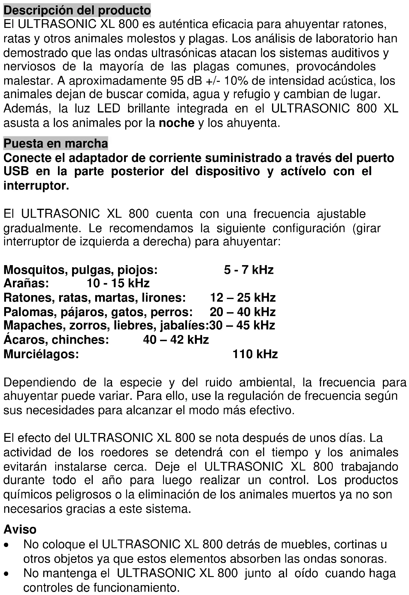 Environmental protection notice At the end of its life span this product may not be disposed as normal household waste but must be disposed of at a collecting place for recycling of electrical and electronic equipment. The icon on the product, in the manual, or on the packing points to this fact. The materials are recyclable according to their labelling. Through reusing, material recycling, or other forms of utilisation of old devices you make an important contribution to the protection of the environment. Please ask the local administration for the responsible waste disposal centre. Instrucciones de uso ULTRASONIC XL 800 Aparato de ultrasonido para ahuyentar roedores e insectos No. de artículo: 62500Descripción del producto El ULTRASONIC XL 800 es auténtica eficacia para ahuyentar ratones, ratas y otros animales molestos y plagas. Los análisis de laboratorio han demostrado que las ondas ultrasónicas atacan los sistemas auditivos y nerviosos de la mayoría de las plagas comunes, provocándoles malestar. A aproximadamente 95 dB +/- 10% de intensidad acústica, los animales dejan de buscar comida, agua y refugio y cambian de lugar. Además, la luz LED brillante integrada en el ULTRASONIC 800 XL asusta a los animales por la noche y los ahuyenta. Puesta en marcha Conecte el adaptador de corriente suministrado a través del puerto USB en la parte posterior del dispositivo y actívelo con el interruptor. El ULTRASONIC XL 800 cuenta con una frecuencia ajustable gradualmente. Le recomendamos la siguiente configuración (girar interruptor de izquierda a derecha) para ahuyentar: Mosquitos, pulgas, piojos: 5 - 7 kHz Arañas: 10 - 15 kHz Ratones, ratas, martas, lirones: 12 – 25 kHz Palomas, pájaros, gatos, perros: 20 – 40 kHz Mapaches, zorros, liebres, jabalíes:30 – 45 kHz Ácaros, chinches: 40 – 42 kHz Murciélagos: 110 kHz Dependiendo de la especie y del ruido ambiental, la frecuencia para ahuyentar puede variar. Para ello, use la regulación de frecuencia según sus necesidades para alcanzar el modo más efectivo. El efecto del ULTRASONIC XL 800 se nota después de unos días. La actividad de los roedores se detendrá con el tiempo y los animales evitarán instalarse cerca. Deje el ULTRASONIC XL 800 trabajando durante todo el año para luego realizar un control. Los productos químicos peligrosos o la eliminación de los animales muertos ya no son necesarios gracias a este sistema. Aviso No coloque el ULTRASONIC XL 800 detrás de muebles, cortinas u otros objetos ya que estos elementos absorben las ondas sonoras. No mantenga el ULTRASONIC XL 800 junto al oído cuando haga controles de funcionamiento.Datos técnicos Interruptor: ON / OFF Soporte de pared: Integrado Frecuencia de trabajo: Aproximadamente 5-110 kHz, ajustable Duración de los intervalo: Frecuencia de aprox. 3 seg. ON, aprox. 27 seg OFF Luz LED: Triple flash durante la noche (fotosensor) Adicional a la frecuencia enviada cada 54 segundos (Función dual para un efecto máximo) Nivel re ruido: Aprox. 95 dB +/- 10 % Alcance: Aproximadamente 200 m² Modos de funcionamiento: Mediante adaptador de CA / CC incluido (220 V AC/6V DC 500mA) y/o con 4 pilas AA de 1,2 V NiMh de 850mA (Recargable directamente con el adaptador CA/CC, baterías no incluidas). Cuando se opera a través de un adaptador USB, las baterías se cargan automáticamente (incluso si el dispositivo está en la posición OFF). No se puede producir una sobrecarga de las baterías (en el dispositivo está integrada una protección). Temperatura de funcionamiento: - 20C° a +50 C° y ≤ 90% Hum. rel. Temperatura de almacenamiento: - 5C° a +50 C° y ≤ 90% Hum. rel. IP45 a prueba de salpicadura Pantalla LED (control de funcionamiento) Posición OFF = sin indicación de LED Posición ON = LED parpadea lentamente en verde cuando se transmite la frecuencia Indicador dde estado de batería Batería con poca carga (aprox. < 3,5 V) = El LED verde parpadea rápidamente (cargue el dispositivo u opere con un adaptador USB) El tiempo de carga es de 8 a 12 horas. Sustitución de la batería