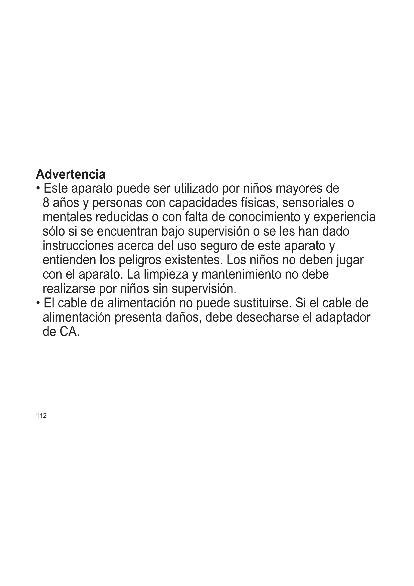 De lo contrario, podría sufrir descargas eléctricas o lesiones. No sumerja el adaptador de CA en agua ni lo lave con agua No coloque el adaptador cerca de un lavabo o una bañera llenos de agua No utilice el aparato si el adaptador de CA está estropeado o si la clavija del cable de alimentación queda oja al conectarla en una toma de corriente No dañe el cable ni la clavija del cable de alimentación