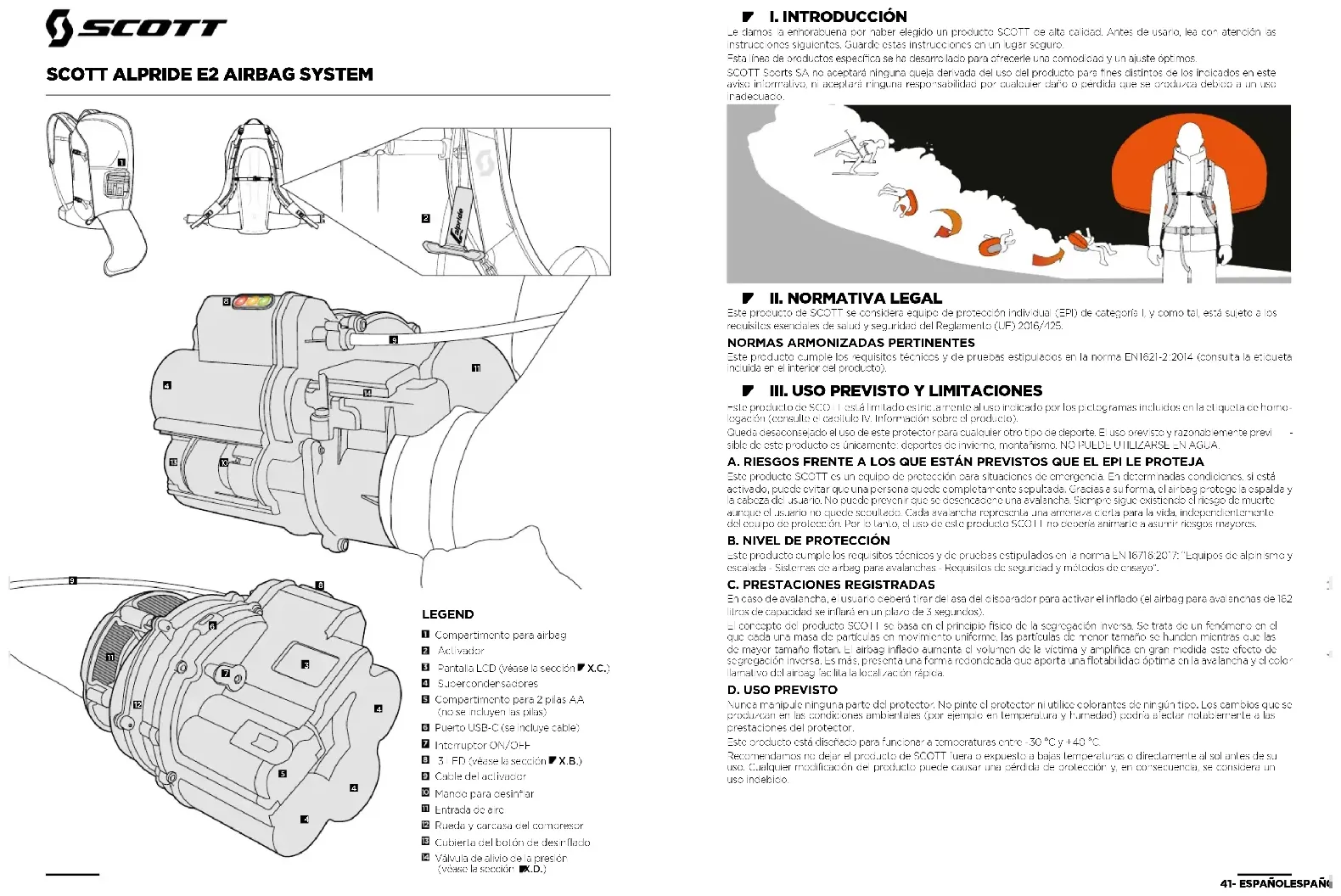 - V. TIEMPO DE OBSOLESCENCIA El equipo de protección individual tiene una vida útil limitada. Para una seguridad óptima, SCOTT recomienda reem- plazar el producto cinco (5) años después de la fecha de compra. El producto podría perder propiedades protectoras tras sufrir impactos fuertes u otros impactos que pudieran dañar el producto. En tales casos será necesario reemplazar el producto. SCOTT no aceptará ninguna responsabilidad por cualquier daño relacionado con el uso de productos que deberían haber sido reemplazados.El producto podría perder propiedades protectoras tras estar en una avalancha, sufrir impactos fuertes u otros impactos que pudieran dañarlo. En tales casos, será necesario reemplazar el producto. El SISTEMA DE AIRBAG SCOTT ALPRIDE E2 está certificado para 50 inflados, tras lo cual debe reemplazarse.