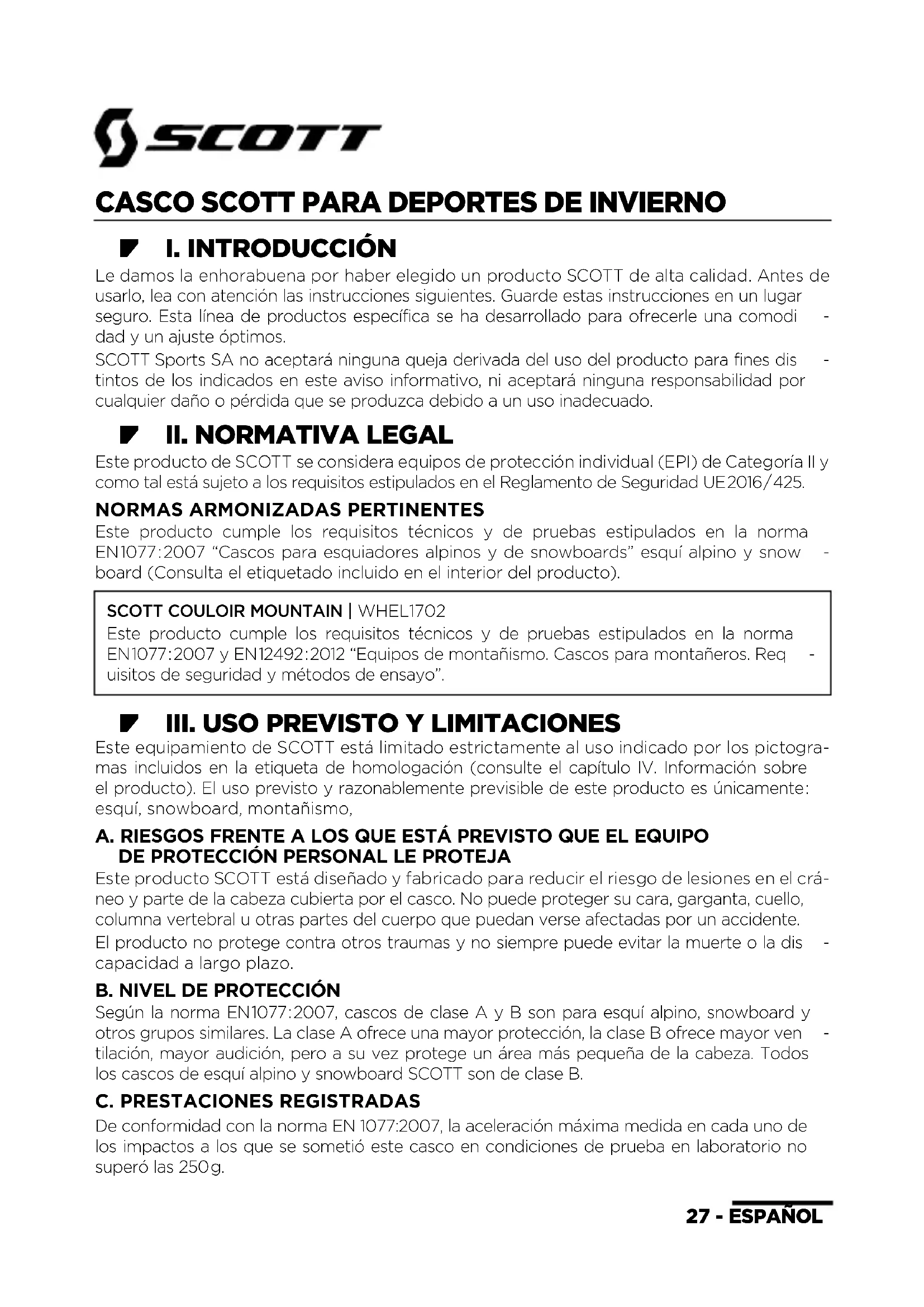 - III. USO PREVISTO Y LIMITACIONES Este equipamiento de SCOTT está limitado estrictamente al uso indicado por los pictogra- mas incluidos en la etiqueta de homologación (consulte el capítulo IV. Información sobre el producto). El uso previsto y razonablemente previsible de este producto es únicamente : esquí, snowboard, montañismo, A. RIESGOS FRENTE A LOS QUE ESTÁ PREVISTO QUE EL EQUIPO