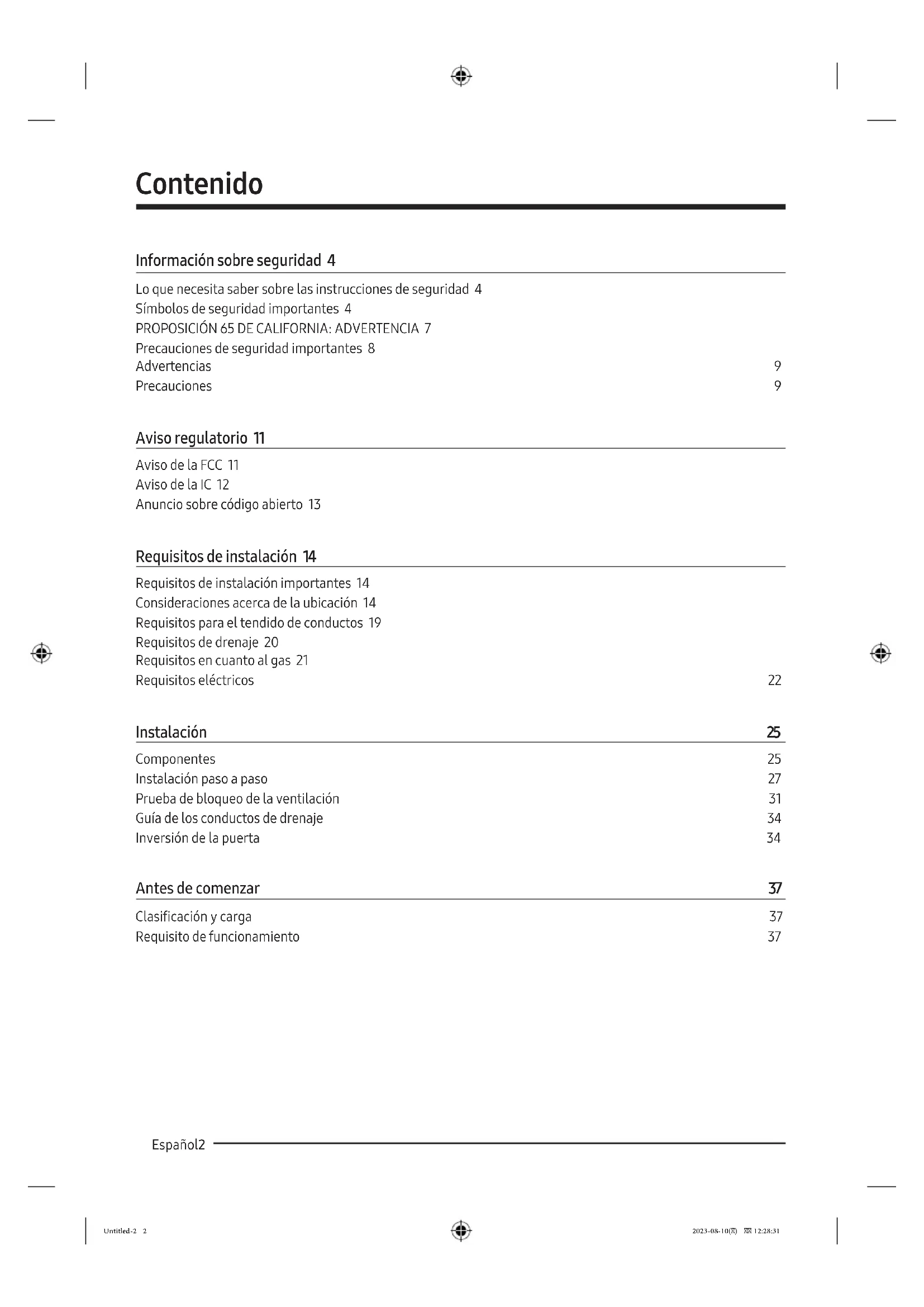 Precauciones de seguridad importantes 8 Advertencias 9 Precauciones 9 Aviso regulatorio 11 Aviso de la FCC 11 Aviso de la IC 12 Anuncio sobre código abierto 13 Requisitos de instalación 14 Requisitos de instalación importantes 14 Consideraciones acerca de la ubicación 14 Requisitos para el tendido de conductos 19 Requisitos de drenaje 20 Requisitos en cuanto al gas 21 Requisitos eléctricos 22 Instalación 25 Componentes 25 Instalación paso a paso 27 Prueba de bloqueo de la ventilación 31 Guía de los conductos de drenaje 34 Inversión de la puerta 34 Antes de comenzar 37 Clasicación y carga 37 Requisito de funcionamiento 37 Untitled-2 2 2023-08-10() 12:28:31Español 3 Funcionamiento 38 Panel de control 38 Sencillos pasos para comenzar 41 Descripción del ciclo 42 Tabla de ciclos 44 Guía de secado 46 Funciones especiales 47 SmartThings 49 Mantenimiento 50 Limpieza 50 Solución de problemas 51 Vericaciones 51 Códigos de información 54 Especicaciones 55 Tabla de indicaciones sobre telas 55 Protección del medio ambiente 56 Hoja de especicaciones 56 Untitled-2 3 2023-08-10() 12:28:31CONSERVE ESTAS INSTRUCCIONES Español4 Información sobre seguridad Felicitaciones por la compra de la nueva secadora Samsung. Este manual contiene información importante acerca de la instalación, el uso y el cuidado del electrodoméstico. Lea detenidamente estas instrucciones a n de aprovechar al máximo los múltiples benecios y funciones de la secadora. Lo que necesita saber sobre las instrucciones de seguridad Lea este manual detenidamente para aprender a utilizar con seguridad y ecacia todas las características y funciones de su nuevo electrodoméstico. Conserve el manual en un lugar seguro cerca del electrodoméstico para consultas futuras. Utilice este electrodoméstico solo para el propósito para el que fue destinado como se describe en este manual. Las advertencias y las instrucciones de seguridad importantes de este manual no cubren todas las posibles condiciones y situaciones que pueden ocurrir. Es su responsabilidad actuar con sentido común, precaución y cuidado cuando instale, realice el mantenimiento y ponga en funcionamiento la secadora. Puesto que las siguientes instrucciones de funcionamiento sirven para varios modelos, las características de su secadora pueden diferir ligeramente de las que se describen en este manual y es posible que no todos los signos de advertencia sean aplicables. Si tiene alguna consulta o duda, comuníquese con el centro de servicio más cercano o busque ayuda e información en línea en www.samsung.com. Símbolos de seguridad importantes Los íconos y las señales incluidas en este manual del usuario signican lo siguiente: ADVERTENCIA Peligros o prácticas inseguras que podrían causar lesiones físicas graves o la muerte y/o daños materiales. PRECAUCIÓN Peligros o prácticas inseguras que podrían causar lesiones físicas y/o daños materiales. NOTA Indica que existe el riesgo de lesiones físicas o daños materiales. Estas señales de advertencia están aquí para evitar que usted u otras personas sufran lesiones. Siga las instrucciones completamente. Después de leer este manual, guárdelo en un lugar seguro para consultas futuras. Lea todas las instrucciones antes de usar el electrodoméstico. Al igual que con cualquier equipo que usa electricidad y piezas movibles, existen riesgos potenciales. Para usar este electrodoméstico en forma segura, familiarícese con su funcionamiento y manéjelo con cuidado cuando lo use. Untitled-2 4 2023-08-10() 12:28:32CONSERVE ESTAS INSTRUCCIONES Español 5 ADVERTENCIA - Riesgo de incendio