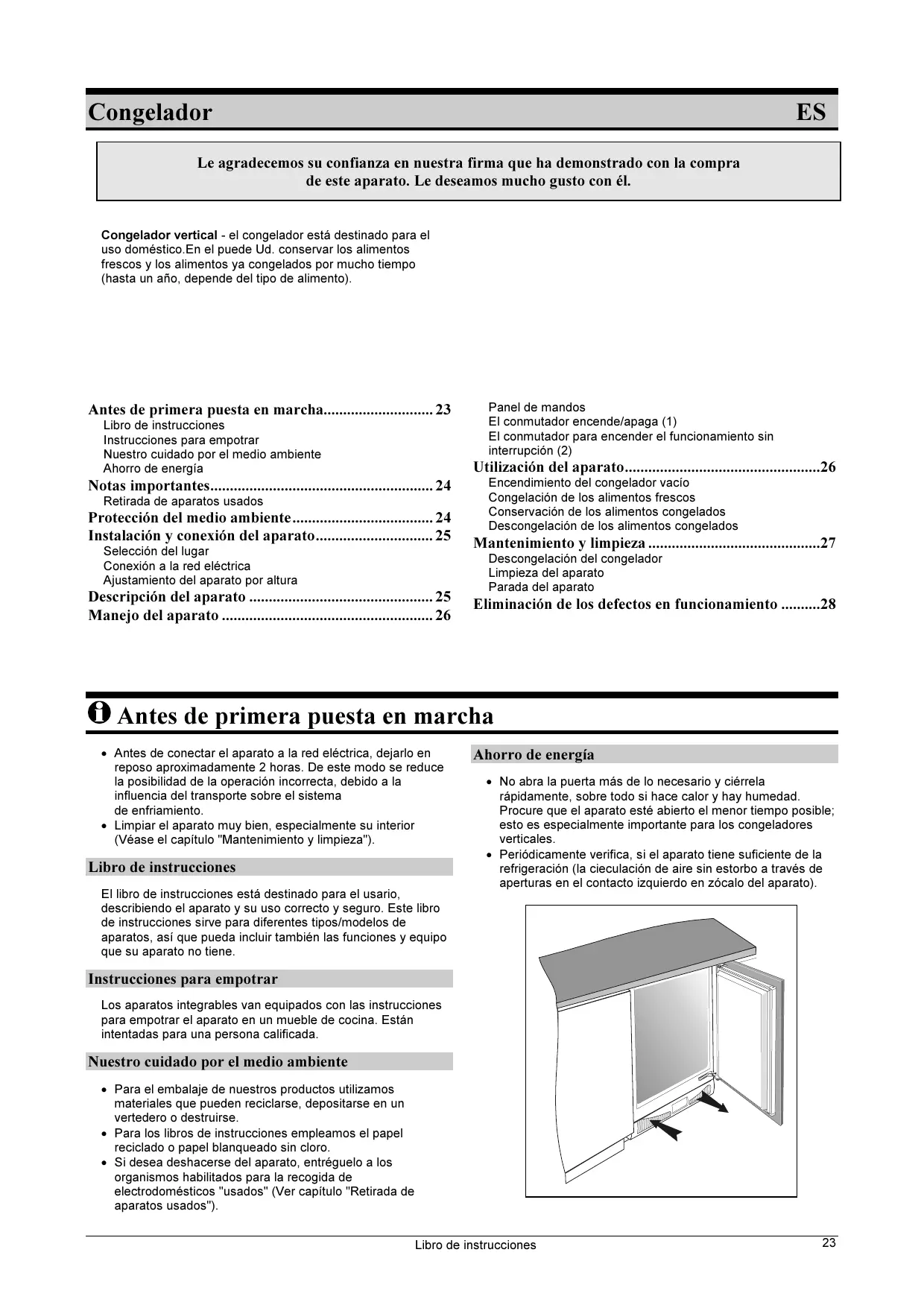 - Le agradecemos su confianza en nuestra firma que ha demonstrado con la compra de este aparato. Le deseamos mucho gusto con él. Congelador vertical - el congelador está destinado para el uso doméstico.En el puede Ud. conservar los alimentos frescos y los alimentos ya congelados por mucho tiempo (hasta un año, depende del tipo de alimento). Antes de primera puesta en marcha p. 23