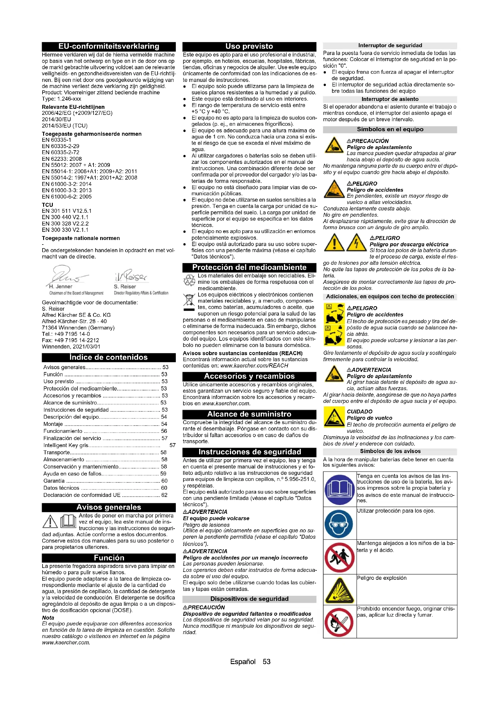 - De ondergetekenden handelen in opdracht en met vol- macht van de directie. Gevolmachtigde voor de documentatie: S. Reiser Alfred Kärcher SE & Co. KG Alfred-Kärcher-Str. 28 - 40 71364 Winnenden (Germany) Tel.: +49 7195 14-0 Fax: +49 7195 14-2212 Winnenden, 2021/03/01 Índice de contenidos Avisos generales Antes de poner en marcha por primera vez el equipo, lea este manual de ins- trucciones y las instrucciones de seguri- dad adjuntas. Actúe conforme a estos documentos. Conserve estos dos manuales para su uso posterior o para propietarios ulteriores. Función La presente fregadora aspiradora sirve para limpiar en húmedo o para pulir suelos llanos. El equipo puede adaptarse a la tarea de limpieza co- rrespondiente mediante el ajuste de la cantidad de agua, la presión de cepillado, la cantidad de detergente y la velocidad de conducción. El detergente se dosifica agregándolo al depósito de agua limpia o a un disposi- tivo de dosificación opcional (DOSE). Nota El equipo puede equiparse con diferentes accesorios en función de la tarea de limpieza en cuestión. Solicite nuestro catálogo o visítenos en internet en la página www.kaercher.com. Uso previsto Este equipo es apto para el uso profesional e industrial, por ejemplo, en hoteles, escuelas, hospitales, fábricas, tiendas, oficinas y negocios de alquiler. Use este equipo únicamente de conformidad con las indicaciones de es- te manual de instrucciones. ● El equipo solo puede utilizarse para la limpieza de suelos planos resistentes a la humedad y al pulido. ● Este equipo está destinado al uso en interiores. ● El rango de temperatura de servicio está entre +5 °C y +40 °C. ● El equipo no es apto para la limpieza de suelos con- gelados (p. ej., en almacenes frigoríficos). ● El equipo es adecuado para una altura máxima de agua de 1 cm. No conduzca hacia una zona si exis- te el riesgo de que se exceda el nivel máximo de agua. ● Al utilizar cargadores o baterías solo se deben utili- zar los componentes autorizados en el manual de instrucciones. Una combinación diferente debe ser confirmada por el proveedor del cargador y/o las ba- terías de forma responsable. ● El equipo no está diseñado para limpiar vías de co- municación públicas. ● El equipo no debe utilizarse en suelos sensibles a la presión. Tenga en cuenta la carga por unidad de su- perficie permitida del suelo. La carga por unidad de superficie por el equipo se especifica en los datos técnicos. ● El equipo no es apto para su utilización en entornos potencialmente explosivos. ● El equipo está autorizado para su uso sobre super- ficies con una pendiente máxima (véase el capítulo "Datos técnicos"). Protección del medioambiente Los materiales del embalaje son reciclables. Eli- mine los embalajes de forma respetuosa con el medioambiente. Los equipos eléctricos y electrónicos contienen materiales reciclables y, a menudo, componen- tes, como baterías, acumuladores o aceite, que suponen un riesgo potencial para la salud de las personas o el medioambiente en caso de manipularse o eliminarse de forma inadecuada. Sin embargo, dichos componentes son necesarios para un servicio adecua- do del equipo. Los equipos identificados con este sím- bolo no pueden eliminarse con la basura doméstica. Avisos sobre sustancias contenidas (REACH) Encontrará información actual sobre las sustancias contenidas en: www.kaercher.com/REACH Accesorios y recambios Utilice únicamente accesorios y recambios originales, estos garantizan un servicio seguro y fiable del equipo. Encontrará información sobre los accesorios y recam- bios en www.kaercher.com. Alcance de suministro Compruebe la integridad del alcance de suministro du- rante el desembalaje. Póngase en contacto con su dis- tribuidor si faltan accesorios o en caso de daños de transporte. Instrucciones de seguridad Antes de utilizar por primera vez el equipo, lea y tenga en cuenta el presente manual de instrucciones y el fo- lleto adjunto relativo a las instrucciones de seguridad para equipos de limpieza con cepillos, n.º 5.956-251.0, y respételas. El equipo está autorizado para su uso sobre superficies con una pendiente limitada (véase el capítulo "Datos técnicos"). 몇 ADVERTENCIA El equipo puede volcarse Peligro de lesiones Utilice el equipo únicamente en superficies que no su- peren la pendiente permitida (véase el capítulo "Datos técnicos"). 몇 ADVERTENCIA Peligro de accidentes por un manejo incorrecto Las personas pueden lesionarse. Los operarios deben estar instruidos de forma adecua- da sobre el uso del equipo. El equipo solo debe utilizarse cuando todas las cubier- tas y tapas están cerradas. Dispositivos de seguridad 몇 PRECAUCIÓN Dispositivo de seguridad faltantes o modificados Los dispositivos de seguridad velan por su seguridad. Nunca modifique ni manipule los dispositivos de segu- ridad. Interruptor de seguridad Para la puesta fuera de servicio inmediata de todas las funciones: Colocar el interruptor de seguridad en la po- sición "0". ● El equipo frena con fuerza al apagar el interruptor de seguridad. ● El interruptor de seguridad actúa directamente so- bre todas las funciones del equipo Interruptor de asiento Si el operador abandona el asiento durante el trabajo o mientras conduce, el interruptor del asiento apaga el motor después de un breve intervalo. Símbolos en el equipo 몇PRECAUCIÓN Peligro de aplastamiento Las manos pueden quedar atrapadas al girar hacia abajo el depósito de agua sucia. No mantenga ninguna parte de su cuerpo entre el depó- sito y el equipo cuando gire hacia abajo el depósito. PELIGRO Peligro de accidentes En pendientes, existe un mayor riesgo de vuelco a altas velocidades. Conduzca lentamente cuesta abajo. No gire en pendientes. Al desplazarse rápidamente, evite girar la dirección de forma brusca con un ángulo de giro amplio. PELIGRO Peligro por descarga eléctrica Si toca los polos de la batería duran- te el proceso de carga, existe el 