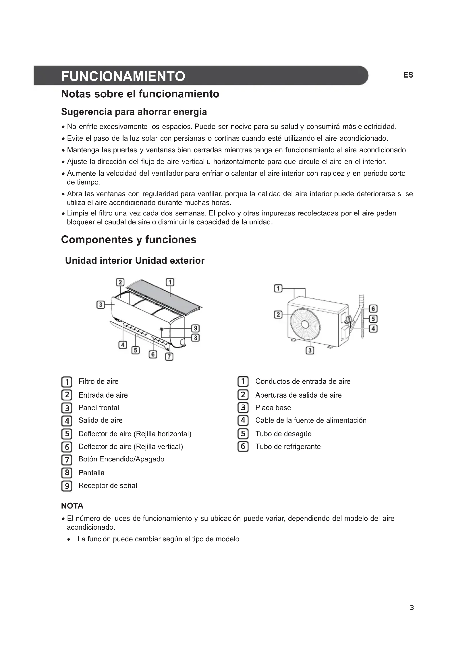 Notas sobre el funcionamiento Sugerencia para ahorrar energía x No enfríe excesivamente los espacios. Puede ser nocivo para su salud y consumirá más electricidad. x Evite el paso de la luz solar con persianas o cortinas cuando esté utilizando el aire acondicionado. x Mantenga las puertas y ventanas bien cerradas mientras tenga en funcionamiento el aire acondicionado. x Ajuste la dirección del flujo de aire vertical u horizontalmente para que circule el aire en el interior. x Aumente la velocidad del ventilador para enfriar o calentar el aire interior con rapidez y en periodo corto de tiempo. x Abra las ventanas con regularidad para ventilar, porque la calidad del aire interior puede deteriorarse si se utiliza el aire acondicionado durante muchas horas. x Limpie el filtro una vez cada dos semanas. El polvo y otras impurezas recolectadas por el aire peden bloquear el caudal de aire o disminuir la capacidad de la unidad. Componentes y funciones Unidad interior Unidad exterior
