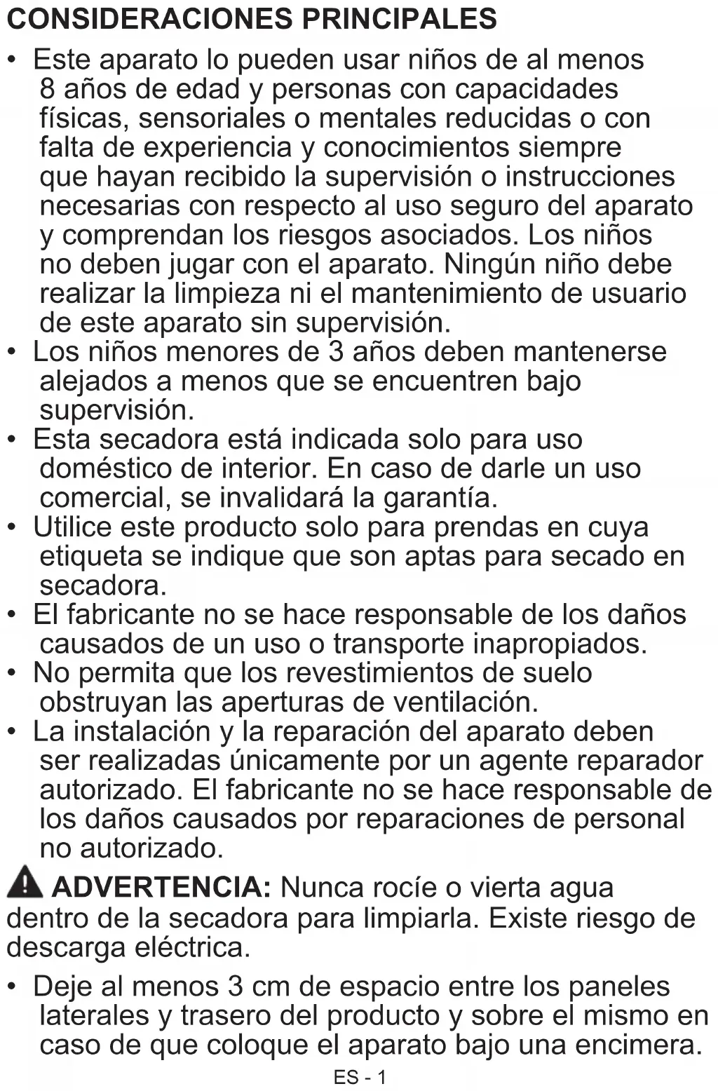 - Esta secadora está indicada solo para uso doméstico de interior. En caso de darle un uso comercial, se invalidará la garantía.