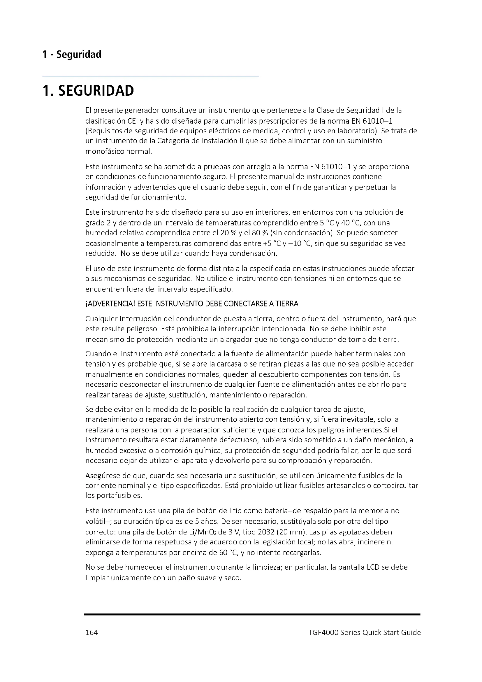 El presente generador constituye un instrumento que pertenece a la Clase de Seguridad I de la clasificación CEI y ha sido diseñada para cumplir las prescripciones de la norma EN 61010−1 (Requisitos de seguridad de equipos eléctricos de medida, control y uso en laboratorio). Se trata de un instrumento de la Categoría de Instalación II que se debe alimentar con un suministro monofásico normal. Este instrumento se ha sometido a pruebas con arreglo a la norma EN 61010−1 y se proporciona en condiciones de funcionamiento seguro. El presente manual de instrucciones contiene información y advertencias que el usuario debe seguir, con el fin de garantizar y perpetuar la seguridad de funcionamiento. Este instrumento ha sido diseñado para su uso en interiores, en entornos con una polución de grado 2 y dentro de un intervalo de temperaturas comprendido entre 5 °C y 40 °C, con una humedad relativa comprendida entre el 20 % y el 80 % (sin condensación). Se puede someter ocasionalmente a temperaturas comprendidas entre +5 °C y −10 °C, sin que su seguridad se vea reducida. No se debe utilizar cuando haya condensación. El uso de este instrumento de forma distinta a la especificada en estas instrucciones puede afectar a sus mecanismos de seguridad. No utilice el instrumento con tensiones ni en entornos que se encuentren fuera del intervalo especificado. ¡ADVERTENCIA! ESTE INSTRUMENTO DEBE CONECTARSE A TIERRA Cualquier interrupción del conductor de puesta a tierra, dentro o fuera del instrumento, hará que este resulte peligroso. Está prohibida la interrupción intencionada. No se debe inhibir este mecanismo de protección mediante un alargador que no tenga conductor de toma de tierra. Cuando el instrumento esté conectado a la fuente de alimentación puede haber terminales con tensión y es probable que, si se abre la carcasa o se retiran piezas a las que no sea posible acceder manualmente en condiciones normales, queden al descubierto componentes con tensión. Es necesario desconectar el instrumento de cualquier fuente de alimentación antes de abrirlo para realizar tareas de ajuste, sustitución, mantenimiento o reparación. Se debe evitar en la medida de lo posible la realización de cualquier tarea de ajuste, mantenimiento o reparación del instrumento abierto con tensión y, si fuera inevitable, solo la realizará una persona con la preparación suficiente y que conozca los peligros inherentes.Si el instrumento resultara estar claramente defectuoso, hubiera sido sometido a un daño mecánico, a humedad excesiva o a corrosión química, su protección de seguridad podría fallar, por lo que será necesario dejar de utilizar el aparato y devolverlo para su comprobación y reparación. Asegúrese de que, cuando sea necesaria una sustitución, se utilicen únicamente fusibles de la corriente nominal y el tipo especificados. Está prohibido utilizar fusibles artesanales o cortocircuitar los portafusibles. Este instrumento usa una pila de botón de litio como batería−de respaldo para la memoria no volátil−; su duración típica es de 5 años. De ser necesario, sustitúyala solo por otra del tipo correcto: una pila de botón de Li/MnO
