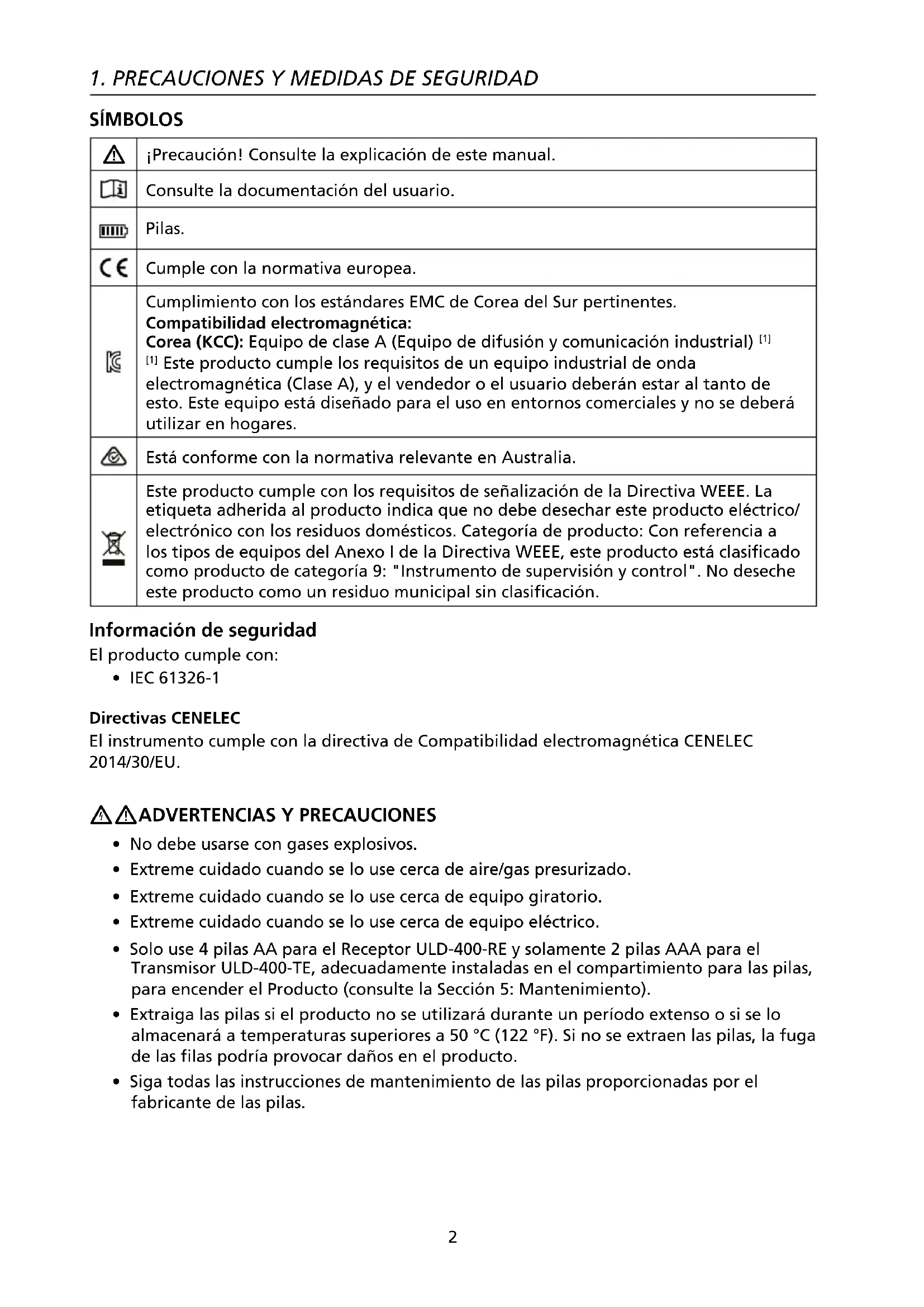 ¡Precaución! Consulte la explicación de este manual. Consulte la documentación del usuario. Pilas. Cumple con la normativa europea. Cumplimiento con los estándares EMC de Corea del Sur pertinentes. Compatibilidad electromagnética: Corea (KCC): Equipo de clase A (Equipo de difusión y comunicación industrial) [1] [1] Este producto cumple los requisitos de un equipo industrial de onda electromagnética (Clase A), y el vendedor o el usuario deberán estar al tanto de esto. Este equipo está diseñado para el uso en entornos comerciales y no se deberá utilizar en hogares. Está conforme con la normativa relevante en Australia. Este producto cumple con los requisitos de señalización de la Directiva WEEE. La etiqueta adherida al producto indica que no debe desechar este producto eléctrico/ electrónico con los residuos domésticos. Categoría de producto: Con referencia a los tipos de equipos del Anexo I de la Directiva WEEE, este producto está clasificado como producto de categoría 9: "Instrumento de supervisión y control". No deseche este producto como un residuo municipal sin clasificación. Información de seguridad El producto cumple con: