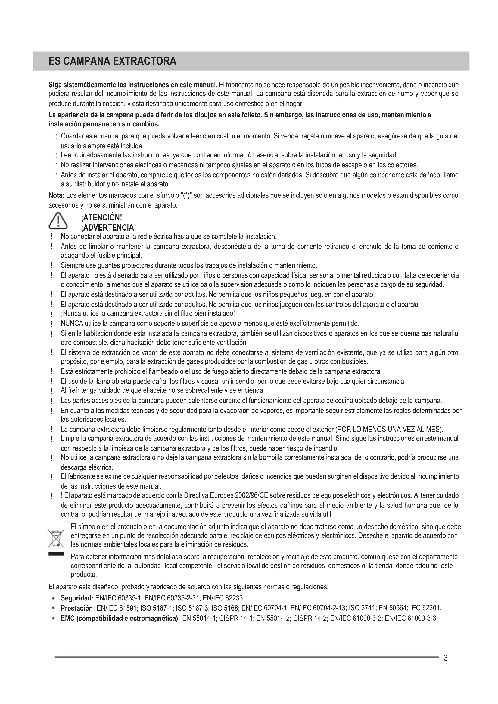El uso de la llama abierta puede dañar los filtros y causar un incendio, por lo que debe evitarse bajo cualquier circunstancia. Al freír tenga cuidado de que el aceite no se sobrecaliente y se encienda. Las partes accesibles de la campana pueden calentarse durante el funcionamiento del aparato de cocina ubicado debajo de la campana. En cuanto a las medidas técnicas y de seguridad para la evaporaci ón de vapores, es importante seguir estrictamente las reglas determinadas por las autoridade s locales. La campana extractora debe limpiarse regularmente tanto desde el interior como desde el exterior (POR LO MENOS UNA VEZ AL MES). Limpie la campana extractora de acuerdo con las instrucciones de mantenimiento de este manual. Si no sigue las instrucciones en este manual con respecto a la limpieza de la campan a extractora y de los filtros, puede haber riesgo de incendio. No utilice la campana extractora o no deje la campana extractora sin la bombilla correctamente instalada, de lo contrario, podría producirse una descarga eléctrica. El fabricante se exime de cualquier responsabilidad por defectos, daños o incendios que puedan surgir en el dispositivo debido al incumplimiento de las instrucciones de este man ual. ! El aparato está marcado de acuerdo con la Directiva Europea 2002/96/CE sobre residuos de equipos eléctricos y electrónicos. Al tener cuidado de eliminar este producto adecuadamente, contribuirá a prevenir los efectos dañinos para el medio ambiente y la salud humana que, de lo contrario, podrían resultar del manejo inadecuado de este producto una vez finalizada su vida útil. El símbolo en el produ cto o en la documentación adjunta indica que el aparato no debe tratarse como un desecho doméstico, sino que debe entregarse en un punto de recolección adecuado para el reciclaje de equipos eléctricos y electrónicos. Deseche el aparato de acuerdo con las normas ambientales locales para la eliminación de residuos. Para obtener información más detallada sobre la recuperación, recolección y reciclaje de este producto, comuníquese con el departamento correspondiente de la autoridad local competente, el servicio local de gestión de residuos domésticos o la tienda donde adquirió este producto. El aparato está diseñado, probado y fabricado de acuerdo con las siguientes normas o regulaciones: Seguridad: EN/IEC 60335-1; EN/IEC 60335-2-31, EN/IEC 62233. Prestación: EN/IEC 61591; ISO 5167-1; ISO 5167-3; ISO 5168; EN/IEC 60704-1; EN/IEC 60704-2-13; ISO 3741; EN 50564; IEC 62301. EMC (compatibilidad electromagnética): EN 55014-1; CISPR 14-1; EN 55014-2; CISPR 14-2; EN/IEC 61000-3-2; EN/IEC 61000-3-3.