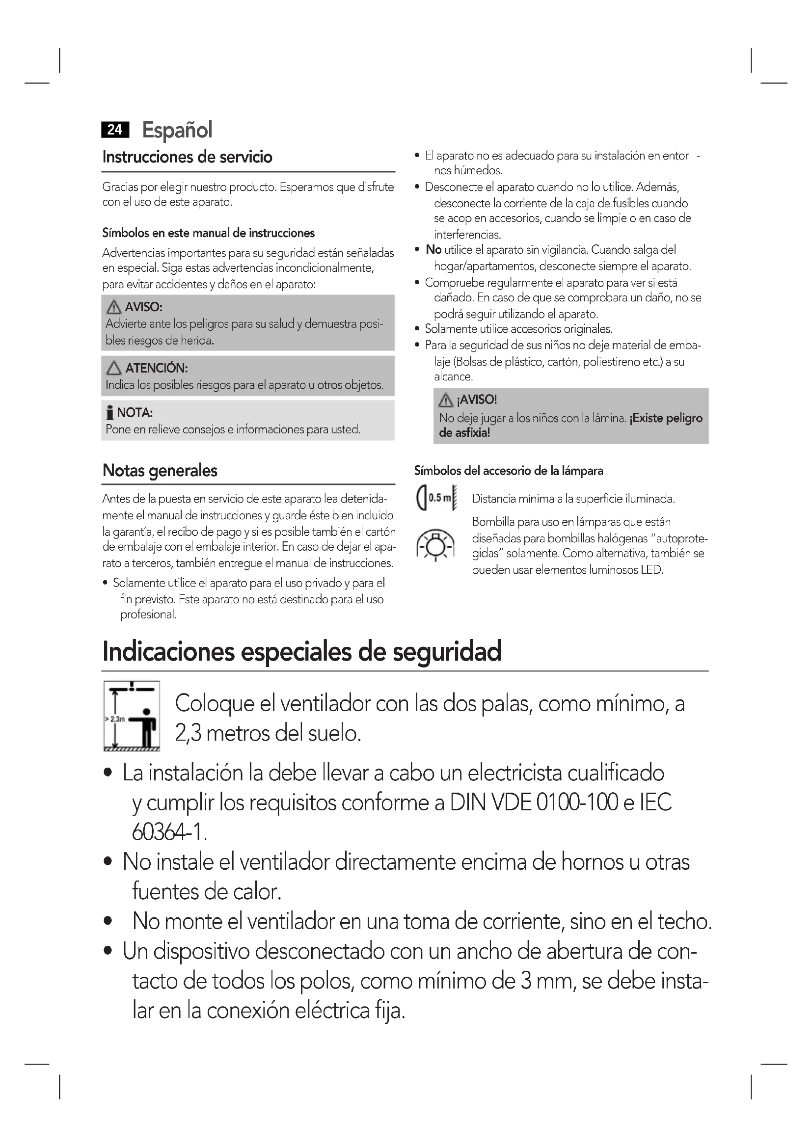Instrucciones de servicio Gracias por elegir nuestro producto. Esperamos que disfrute con el uso de este aparato.Símbolos en este manual de instruccionesAdvertencias importantes para su seguridad están señaladas en especial. Siga estas advertencias incondicionalmente, para evitar accidentes y daños en el aparato: AVISO: Advierte ante los peligros para su salud y demuestra posi bles riesgos de herida. ATENCIÓN: Indica los posibles riesgos para el aparato u otros objetos. NOTA: Pone en relieve consejos e informaciones para usted. Notas generales Antes de la puesta en servicio de este aparato lea detenida-mente el manual de instrucciones y guarde éste bien incluido la garantía, el recibo de pago y si es posible también el cartón de embalaje con el embalaje interior. En caso de dejar el apa-rato a terceros, también entregue el manual de instrucciones.• Solamente utilice el aparato para el uso privado y para el fin previsto. Este aparato no está destinado para el uso profesional.• El aparato no es adecuado para su instalación en entor nos húmedos.• Desconecte el aparato cuando no lo utilice. Además, desconecte la corriente de la caja de fusibles cuando se acoplen accesorios, cuando se limpie o en caso de interferencias.• No utilice el aparato sin vigilancia. Cuando salga del hogar/apartamentos, desconecte siempre el aparato.• Compruebe regularmente el aparato para ver si está dañado. En caso de que se comprobara un daño, no se podrá seguir utilizando el aparato.• Solamente utilice accesorios originales.• Para la seguridad de sus niños no deje material de emba-laje (Bolsas de plástico, cartón, poliestireno etc.) a su alcance. ¡AVISO! No deje jugar a los niños con la lámina. ¡Existe peligro de asfixia!Símbolos del accesorio de la lámparaDistancia mínima a la superficie iluminada.Bombilla para uso en lámparas que están diseñadas para bombillas halógenas “autoprote-gidas” solamente. Como alternativa, también se pueden usar elementos luminosos LED. Indicaciones especiales de seguridad Coloque el ventilador con las dos palas, como mínimo, a 2,3metros del suelo.