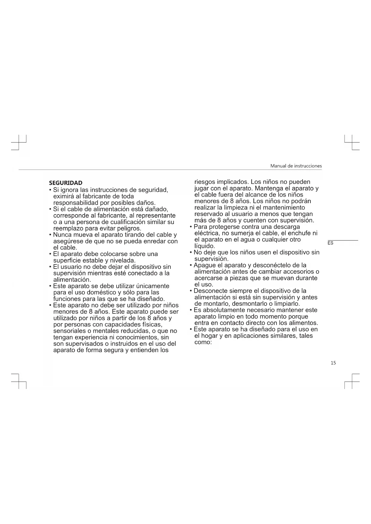 - Este aparato no debe ser utilizado por niños menores de 8 años. Este aparato puede ser utilizado por niños a partir de los 8 años y por personas con capacidades físicas, sensoriales o mentales reducidas, o que no tengan experiencia ni conocimientos, sin son supervisados o instruidos en el uso del aparato de forma segura y entienden los riesgos implicados. Los niños no pueden jugar con el aparato. Mantenga el aparato y el cable fuera del alcance de los niños menores de 8 años. Los niños no podrán realizar la limpieza ni el mantenimiento reservado al usuario a menos que tengan más de 8 años y cuenten con supervisión.