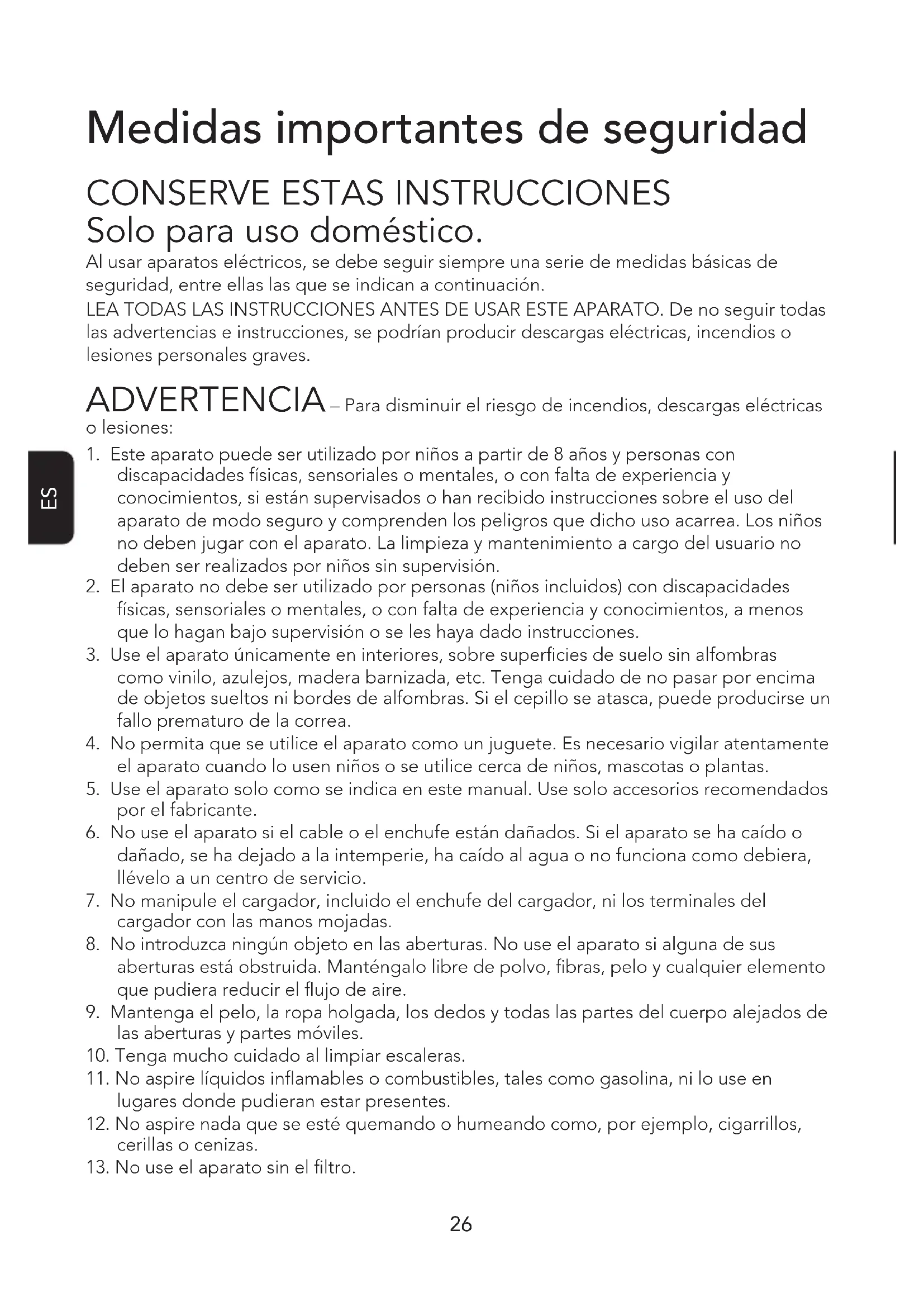 Solo para uso doméstico. Al usar aparatos eléctricos, se debe seguir siempre una serie de medidas básicas de seguridad, entre ellas las que se indican a continuación. LEA TODAS LAS INSTRUCCIONES ANTES DE USAR ESTE APARATO. De no seguir todas las advertencias e instrucciones, se podrían producir descargas eléctricas, incendios o lesiones personales graves. ADVERTENCIA – Para disminuir el riesgo de incendios, descargas eléctricas o lesiones: