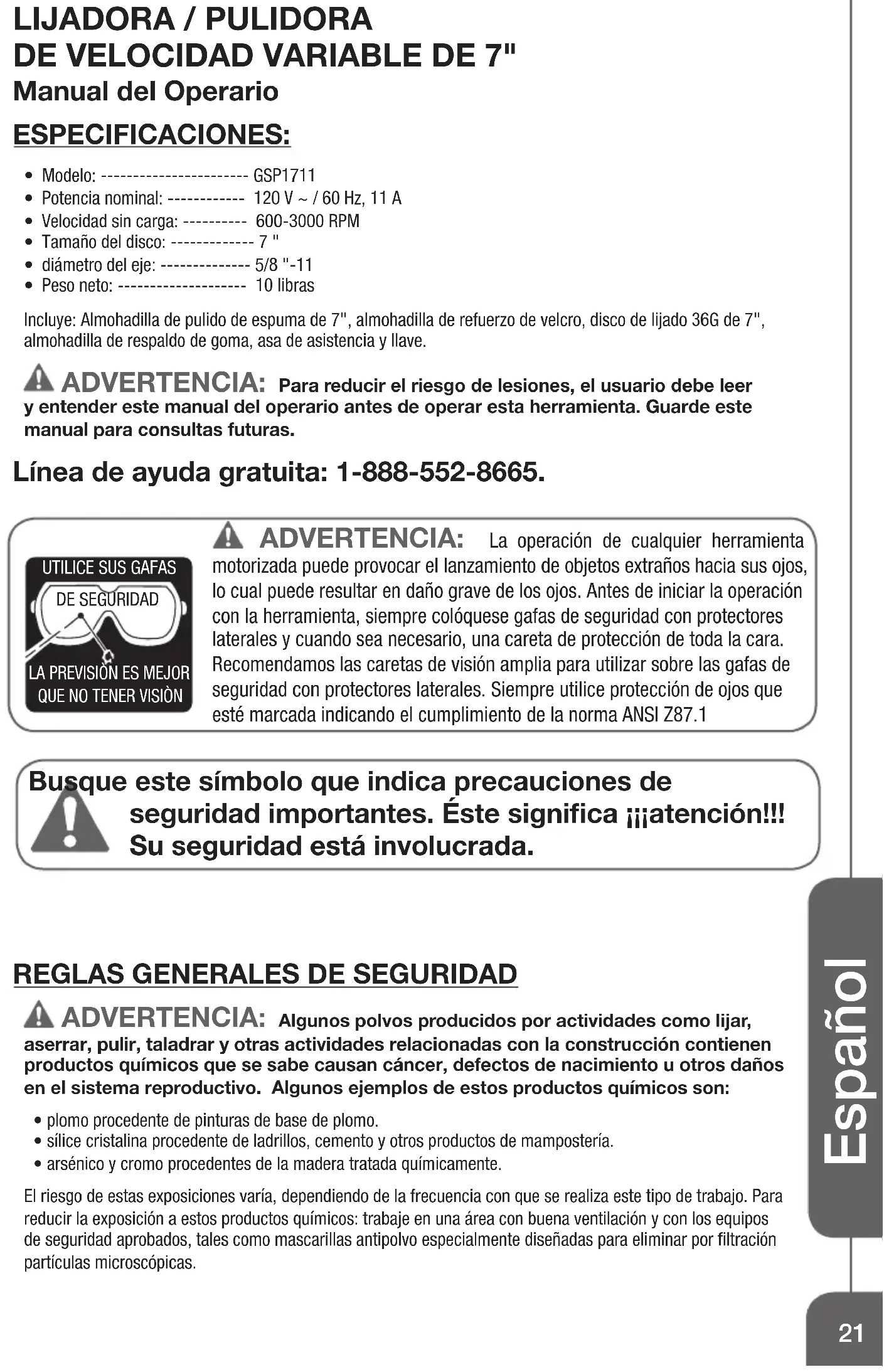 - Modelo: ----------------------- GSP1711• Potencia nominal: ------------ 120 V ~ / 60 Hz, 11 A• Velocidad sin carga: ---------- 600-3000 RPM• Tamaño del disco: ------------- 7 "• diámetro del eje: -------------- 5/8 "-11• Peso neto: -------------------- 10 librasIncluye: Almohadilla de pulido de espuma de 7", almohadilla de refuerzo de velcro, disco de lijado 36G de 7", almohadilla de respaldo de goma, asa de asistencia y llave. ADVERTENCIA: Para reducir el riesgo de lesiones, el usuario debe leer y entender este manual del operario antes de operar esta herramienta. Guarde este manual para consultas futuras. Línea de ayuda gratuita: 1-888-552-8665. ADVERTENCIA: La operación de cualquier herramienta motorizada puede provocar el lanzamiento de objetos extraños hacia sus ojos, lo cual puede resultar en daño grave de los ojos. Antes de iniciar la operación con la herramienta, siempre colóquese gafas de seguridad con protectores laterales y cuando sea necesario, una careta de protección de toda la cara. Recomendamos las caretas de visión amplia para utilizar sobre las gafas de seguridad con protectores laterales. Siempre utilice protección de ojos que esté marcada indicando el cumplimiento de la norma ANSI Z87.1 Busque este símbolo que indica precauciones de seguridad importantes. Éste significa ¡¡¡atención!!! Su seguridad está involucrada.