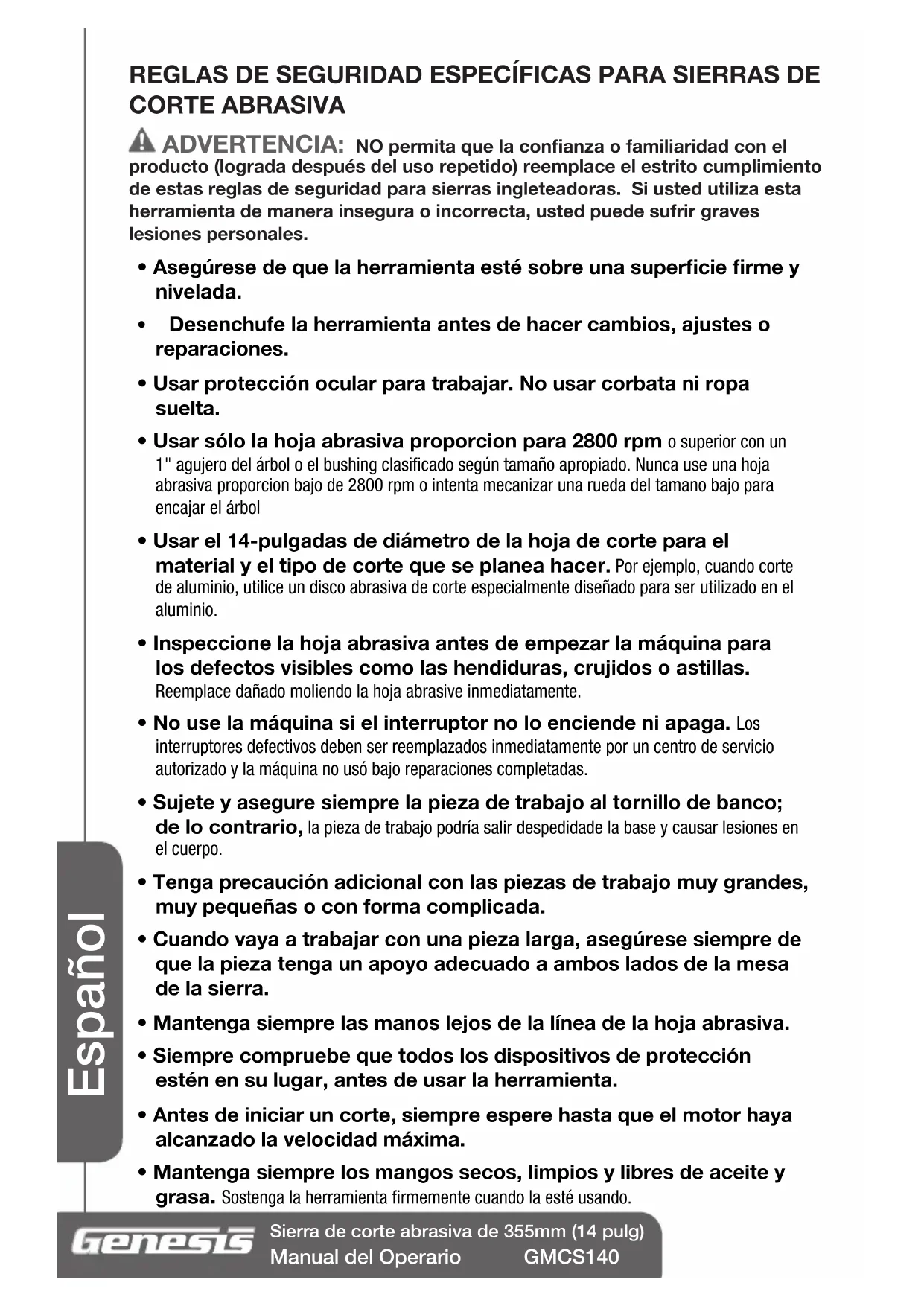 Calibre de alambre mínimo recomendado para cables de extensión (120 Voltios)Amperios según la placa de datos (a plena carga)Longitud del cable de extensión25 pies 50 pies 75 pies 100 pies 150 pies 200 pies0–2.0 2.1–3.4 3.5–5.0 5.1–7.0 7.1–12.0 12.1–16.0 16.1–20.0 Español Sierra de corte abrasiva de 355mm (14 pulg) Manual del Operario GMCS140 REGLAS DE SEGURIDAD ESPECÍFICAS PARA SIERRAS DE CORTE ABRASIVA ADVERTENCIA: NO permita que la confianza o familiaridad con el producto (lograda después del uso repetido) reemplace el estrito cumplimiento de estas reglas de seguridad para sierras ingleteadoras. Si usted utiliza esta herramienta de manera insegura o incorrecta, usted puede sufrir graves lesiones personales.