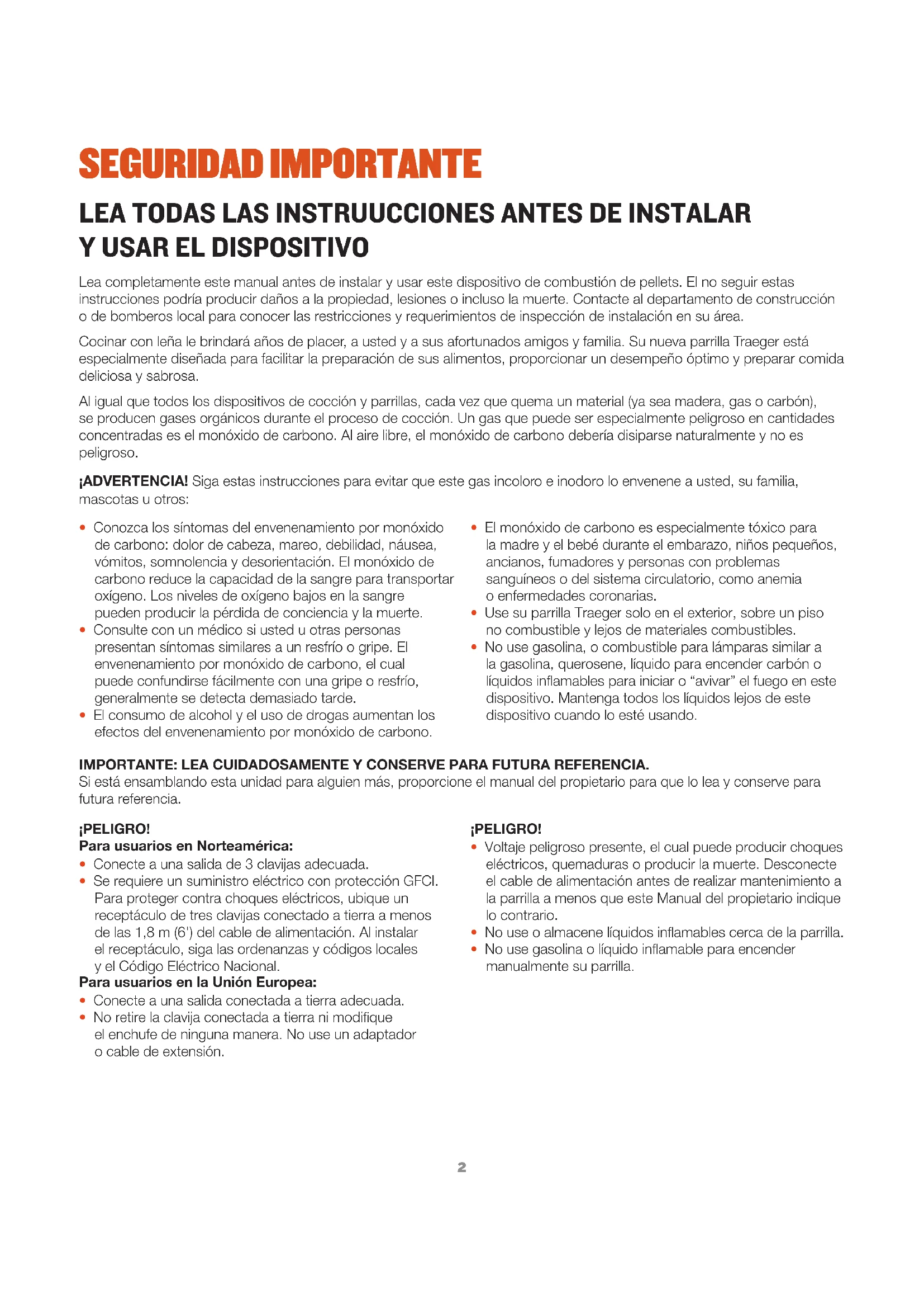 - No use gasolina, o combustible para lámparas similar a la gasolina, querosene, líquido para encender carbón o líquidos inamables para iniciar o “avivar” el fuego en este dispositivo. Mantenga todos los líquidos lejos de este dispositivo cuando lo esté usando. Lea completamente este manual antes de instalar y usar este dispositivo de combustión de pellets. El no seguir estas instrucciones podría producir daños a la propiedad, lesiones o incluso la muerte. Contacte al departamento de construcción o de bomberos local para conocer las restricciones y requerimientos de inspección de instalación en su área. Cocinar con leña le brindará años de placer, a usted y a sus afortunados amigos y familia. Su nueva parrilla Traeger está especialmente diseñada para facilitar la preparación de sus alimentos, proporcionar un desempeño óptimo y preparar comida deliciosa y sabrosa. Al igual que todos los dispositivos de cocción y parrillas, cada vez que quema un material (ya sea madera, gas o carbón), se producen gases orgánicos durante el proceso de cocción. Un gas que puede ser especialmente peligroso en cantidades concentradas es el monóxido de carbono. Al aire libre, el monóxido de carbono debería disiparse naturalmente y no es peligroso. ¡ADVERTENCIA! Siga estas instrucciones para evitar que este gas incoloro e inodoro lo envenene a usted, su familia, mascotas u otros: IMPORTANTE: LEA CUIDADOSAMENTE Y CONSERVE PARA FUTURA REFERENCIA. Si está ensamblando esta unidad para alguien más, proporcione el manual del propietario para que lo lea y conserve para futura referencia. SEGURIDAD IMPORTANTE ¡PELIGRO! Para usuarios en Norteamérica: