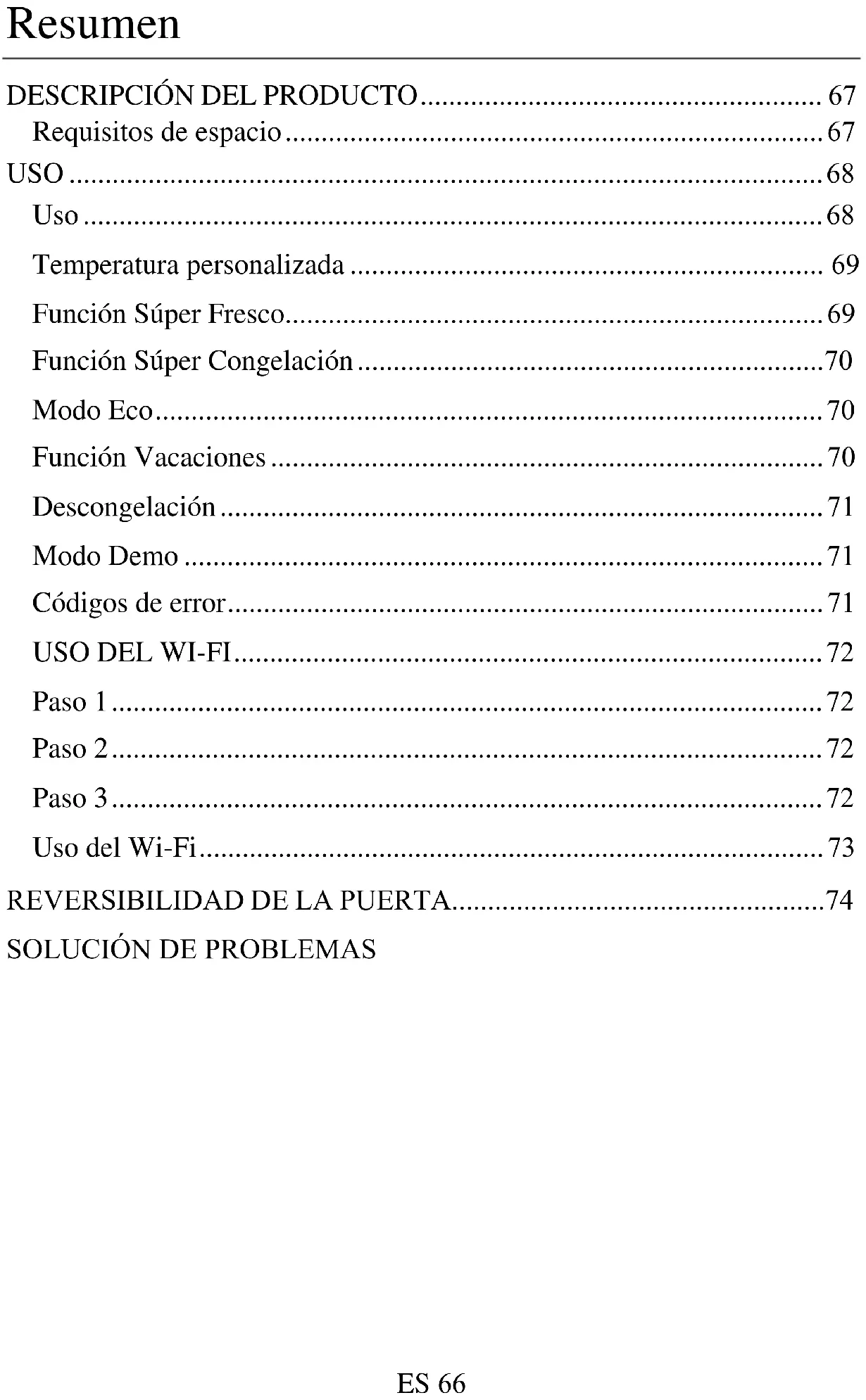 La bombilla interior no se enciende. ● No hay electricidad. El cable de alimentación no se ha enchufado correctamente. Compruebe si el aparato está apagado (véase Ajuste de la temperatura). Compruebe que la toma de corriente funciona correctamente (por ejemplo, con otro aparato eléctrico). ● El modo Holiday está activado. Desactive el modo Holiday. La temperatura interna del frigorífico y/o congelador no es lo suficientemente fría. ● Las puertas no están cerradas. Compruebe que la puerta y las juntas cierren correctamente. ● Las puertas se abren con demasiada frecuencia. Evite abrir las puertas innecesariamente durante algún tiempo. ● Ajuste incorrecto de la temperatura. Compruebe el ajuste de la temperatura y, si es posible, ajuste una temperatura más baja (véase Ajuste de la temperatura). ● El frigorífico y/o el congelador están demasiado llenos. Espere a que se estabilice la temperatura del frigorífico/congelador. Evite llenar excesivamente el frigorífico y el congelador. ● La temperatura ambiente es demasiado baja. Traslade la unidad a un lugar más cálido o caliente la estancia actual. ● Se han guardado objetos calientes. Deje siempre que los objetos se enfríen antes de guardarlos. Los alimentos se congelan en el interior del frigorífico. ● Ajuste incorrecto de la temperatura. Compruebe el ajuste de la temperatura y, si es posible, aumente la temperatura. ● Alimentos en contacto con la pared posterior. Mantenga los alimentos alejados de la pared trasera del frigorífico. El fondo del compartimento frigorífico está húmedo o hay gotas de agua. ● La manguera de desagüe podría estar obstruida. Limpie la manguera de desagüe con un palo o elemento similar para permitir que el agua drene. Presencia de gotas de agua o escarcha en la pared trasera del frigorífico. ● Dependiendo de la función, se forman gotas de agua o escarcha en la pared trasera del frigorífico durante el funcionamiento. No es un defecto. ● Se han guardado objetos calientes. Deje siempre que los objetos se enfríen antes de guardarlos. ● Hay recipientes de comida o líquidos abiertos. Cubra siempre los alimentos y los líquidos. ● Las puertas no están cerradas. Compruebe que la puerta y las juntas cierren correctamente. ● Las puertas se abren con demasiada frecuencia. Evite abrir las puertas innecesariamente durante algún tiempo. Presencia de agua en el cajón de las verduras. ● Falta de circulación de aire. Compruebe que su aparato no está demasiado lleno. ● Frutas y verduras con exceso de humedad. Envuelva las frutas y verduras en materiales plásticos, como film transparente, bolsas o recipientes. El motor funciona de manera continua. ● Las puertas no están cerradas. Asegúrese de que las puertas estén cerradas y compruebe que las juntas se encuentren en buen estado. ● Las puertas se abren con frecuencia. Evite abrir las puertas innecesariamente durante algún tiempo. ● La temperatura ambiente es demasiado elevada. Compruebe que la temperatura ambiente se encuentra dentro del intervalo establecido en las especificaciones de la etiqueta del aparato. Ajuste la pantalla/termostato a una temperatura más cálida. ● El aparato ha estado apagado (sin corriente) durante algún tiempo. Normalmente, el aparato tarda entre 8 y 12 horas en enfriarse por completo. Los alimentos congelados se están descongelando. ● La temperatura ambiente es demasiado baja. Traslade la unidad a un lugar más cálido o caliente la estancia actual. ● La puerta del congelador no está cerrada. Asegúrese de que la puerta esté cerrada y de que la junta se encuentre en buen estado. Alarma de la puerta del frigorífico. ● La alarma de la puerta del frigorífico (pitido acústico) se activa cuando la puerta permanece abierta durante más de 3 minutos. Evite dejar la puerta abierta cuando no sea necesario. El pitido cesa cuando se cierra la puerta. El aparato hace ruidos como gorgoteos, zumbidos, chasquidos, crujidos. ● Sin averías. Hay un motor en marcha, por ejemplo, una unidad de refrigeración o un ventilador. El refrigerante fluye por las tuberías. El motor, los interruptores y las electroválvulas se conectan o desconectan. No es necesaria ninguna acción. ● El electrodoméstico no está ubicado sobre una superficie plana. Ajuste las patas para nivelar el electrodoméstico. ● El electrodoméstico toca algún objeto a su alrededor. Retire los objetos que haya alrededor del electrodoméstico. El aparato no enfría, los indicadores de temperatura e iluminación están encendidos. ● El modo Demo está activado. Desactive el modo DEMO. Hay mucho hielo y escarcha en el compartimento congelador. ● Los artículos no están correctamente embalados. Empaquete bien los artículos. ● Una puerta/cajón del electrodoméstico no está bien cerrada. Cierre la puerta/cajón. ● La puerta/cajón se ha abierto con demasiada frecuencia o durante mucho tiempo. No abra la puerta/cajón con demasiada frecuencia. ● La junta de la puerta/cajón está sucia, desgastada, agrietada o desparejada. Limpie la junta de la puerta/cajón o sustitúyala por una nueva. ● Algo en el interior impide que la puerta/cajón se cierre correctamente. Vuelva a colocar los estantes, estantes de la puerta o contenedores internos para permitir que la puerta/cajón se cierre. Los laterales del aparato están calientes. ● Esto es normal.FI 75