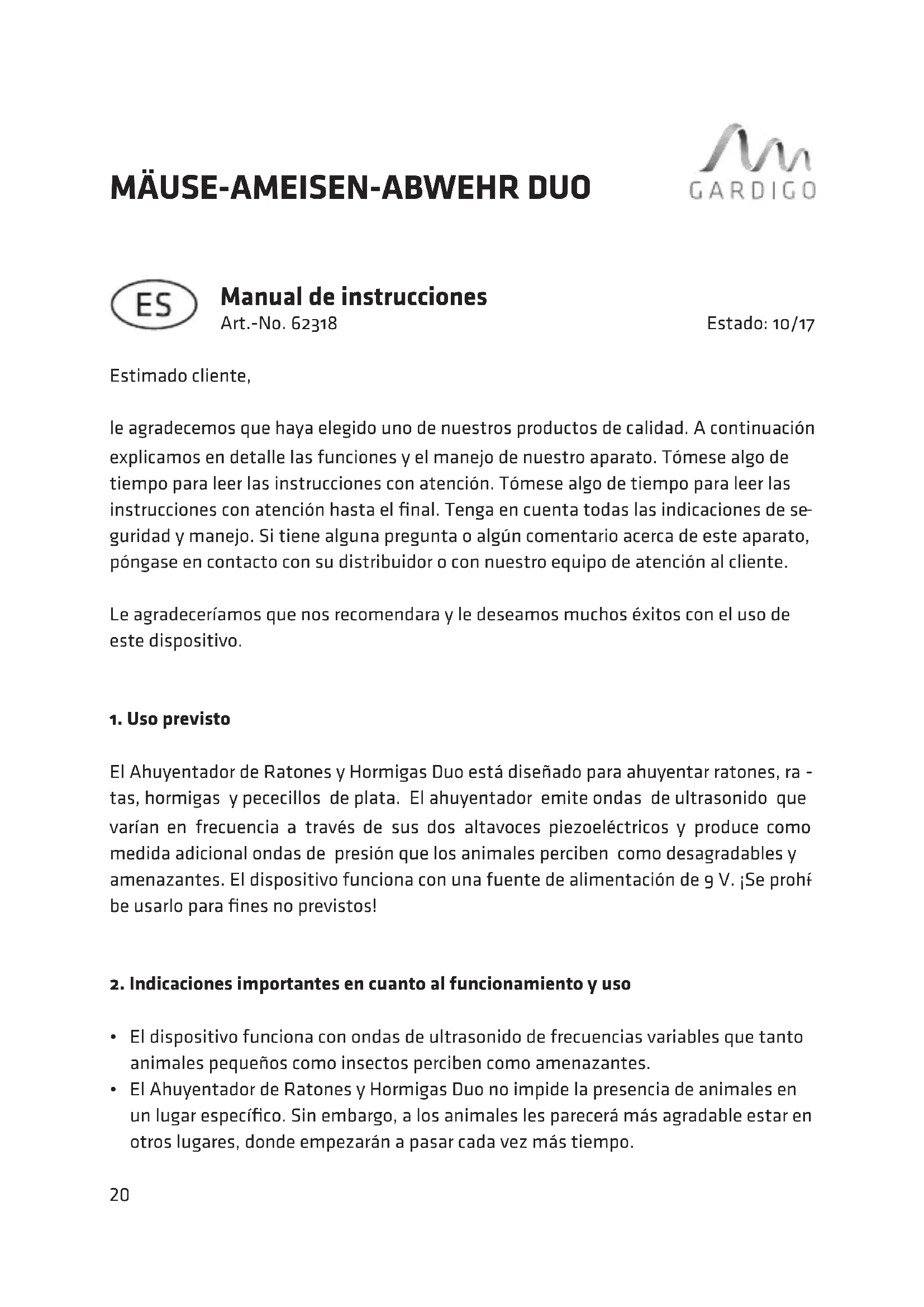 MANUAL DE USUARIO 62318 Gardigo