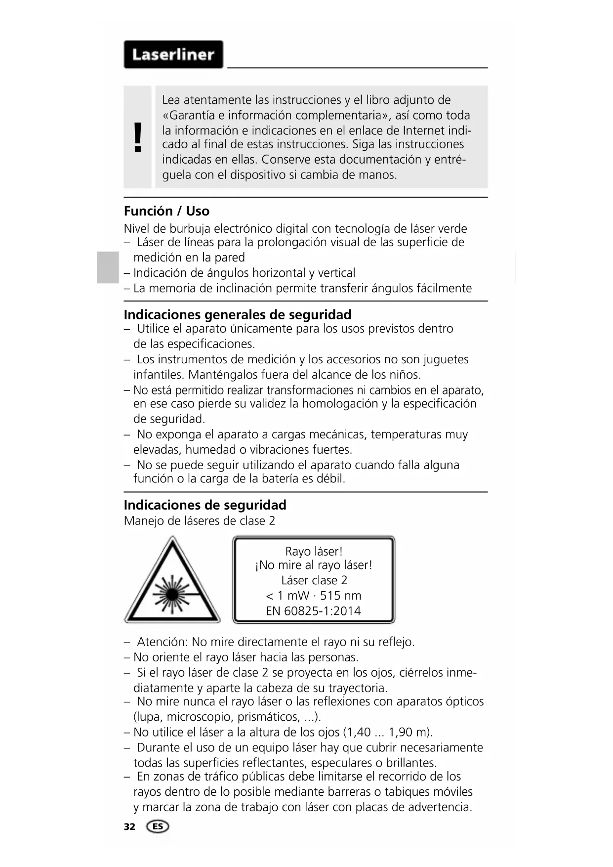No está permitido realizar transformaciones ni cambios en el aparato, en ese caso pierde su validez la homologación y la especicación de seguridad. – No exponga el aparato a cargas mecánicas, temperaturas muy elevadas, humedad o vibraciones fuertes. – No se puede seguir utilizando el aparato cuando falla alguna función o la carga de la batería es débil. Nivel de burbuja electrónico digital con tecnología de láser verde – Láser de líneas para la prolongación visual de las supercie de medición en la pared – Indicación de ángulos horizontal y vertical – La memoria de inclinación permite transferir ángulos fácilmente Función / Uso Lea atentamente las instrucciones y el libro adjunto de «Garantía e información complementaria», así como toda la información e indicaciones en el enlace de Internet indi- cado al final de estas instrucciones. Siga las instrucciones indicadas en ellas. Conserve esta documentación y entré- guela con el dispositivo si cambia de manos.