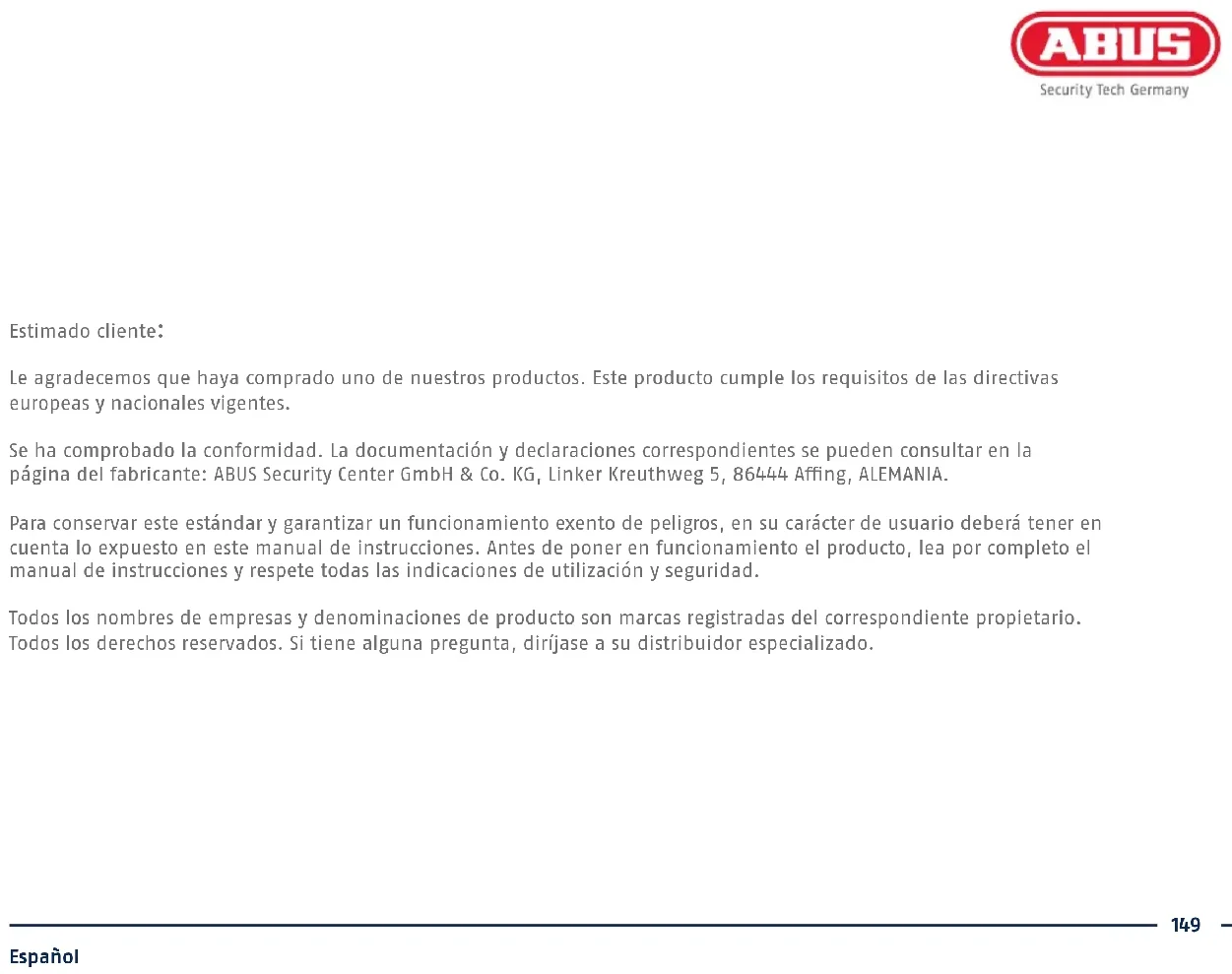 GRABADORA IP En esta guía rápida se describen los primeros pasos para instalar la grabadora IP. Encontrará información detallada en el manual de instrucciones disponible en la página web abus.com.149 Español Estimado cliente: Le agradecemos que haya comprado uno de nuestros productos. Este producto cumple los requisitos de las directivas europeas y nacionales vigentes. Se ha comprobado la conformidad. La documentación y declaraciones correspondientes se pueden consultar en la página del fabricante: ABUS Security Center GmbH & Co. KG, Linker Kreuthweg 5, 86444 Ang, ALEMANIA. Para conservar este estándar y garantizar un funcionamiento exento de peligros, en su carácter de usuario deberá tener en cuenta lo expuesto en este manual de instrucciones. Antes de poner en funcionamiento el producto, lea por completo el manual de instrucciones y respete todas las indicaciones de utilización y seguridad. Todos los nombres de empresas y denominaciones de producto son marcas registradas del correspondiente propietario. Todos los derechos reservados. Si tiene alguna pregunta, diríjase a su distribuidor especializado.150 Español