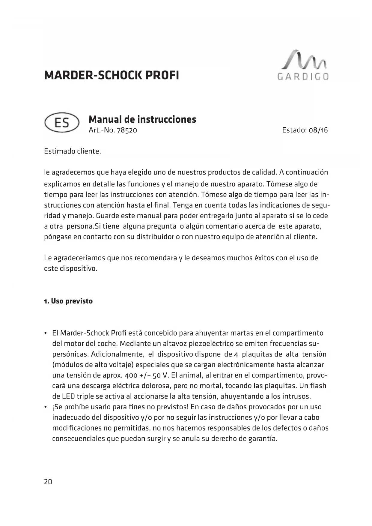- ¡Se prohíbe usarlo para fines no previstos! En caso de daños provocados por un uso inadecuado del dispositivo y/o por no seguir las instrucciones y/o por llevar a cabo modificaciones no permitidas, no nos hacemos responsables de los defectos o daños consecuenciales que puedan surgir y se anula su derecho de garantía. MARDER-SCHOCK PROFI Estado: 08/1621